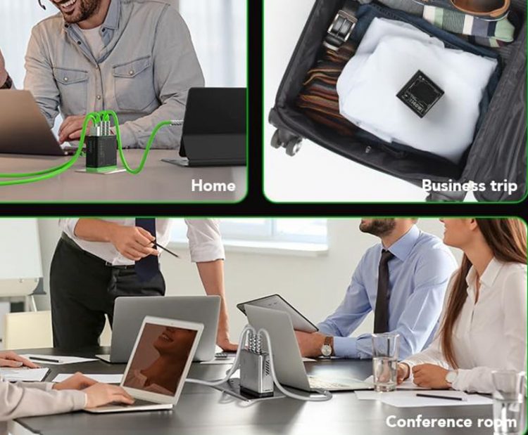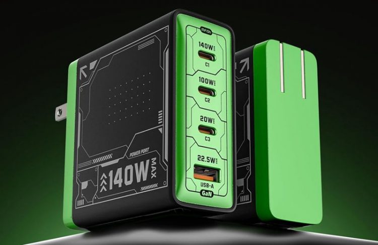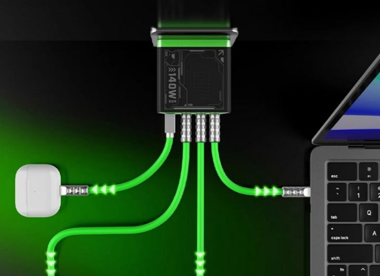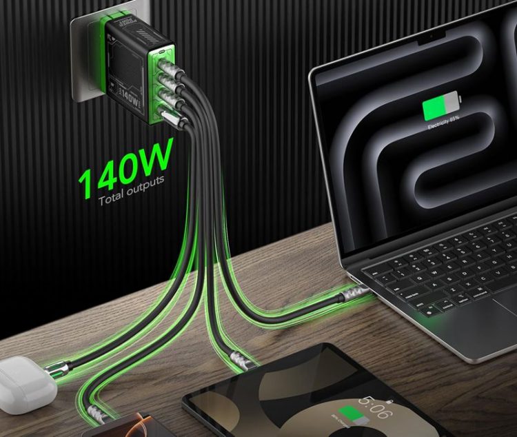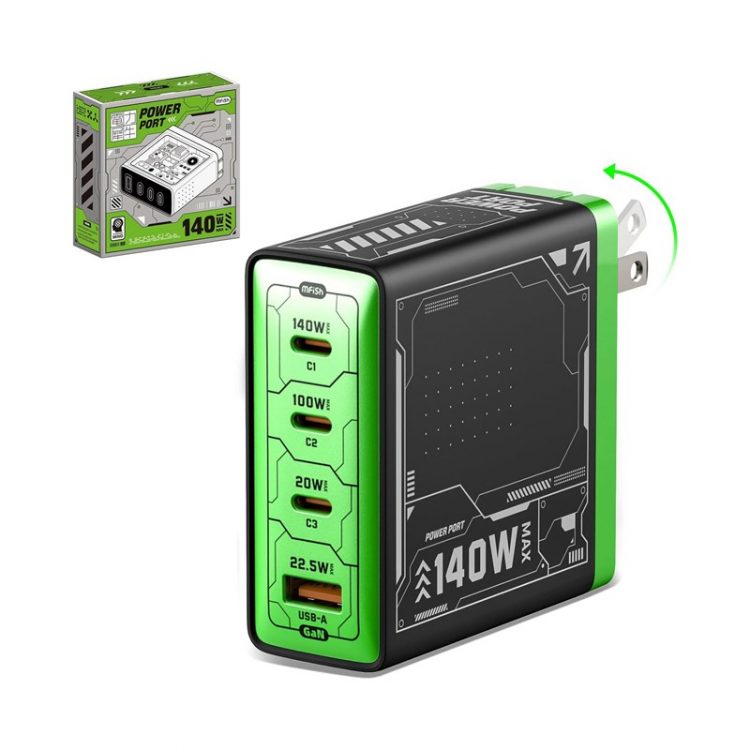黑鱼 mFish 电力犀牛 140W 氮化镓充电器四口输出,支持同时给多个笔记本电脑、平板、手机充电供电,支持快充,方便旅行使用。