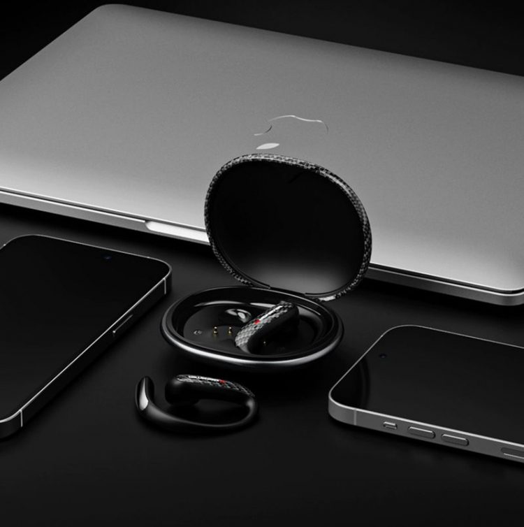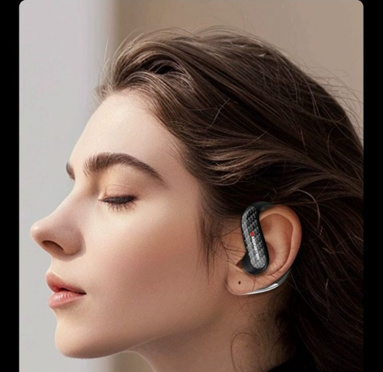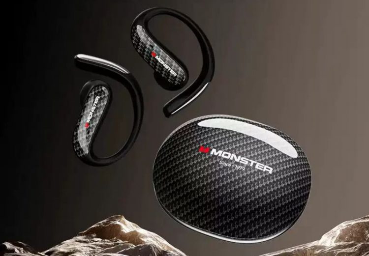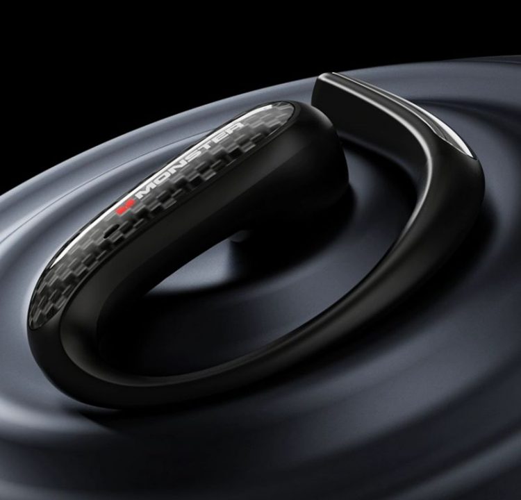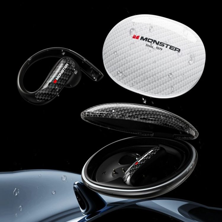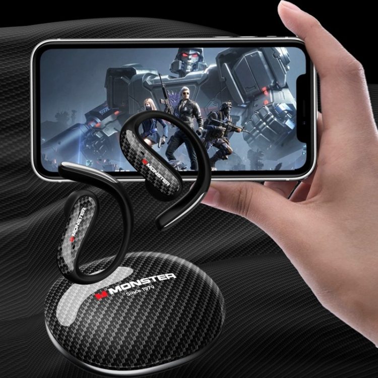 魔声 MONSTER MQO37 蓝牙耳机挂耳式佩戴,开放耳道,稳固舒适,外观碳纤维纹理,蓝牙 6.0 连接,高清通话,方便运动。