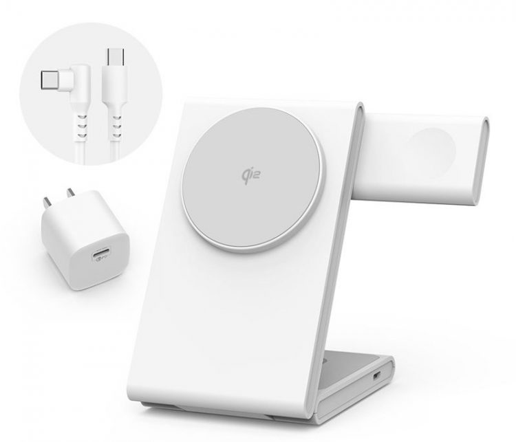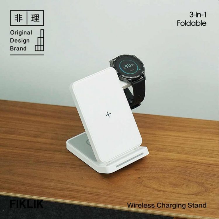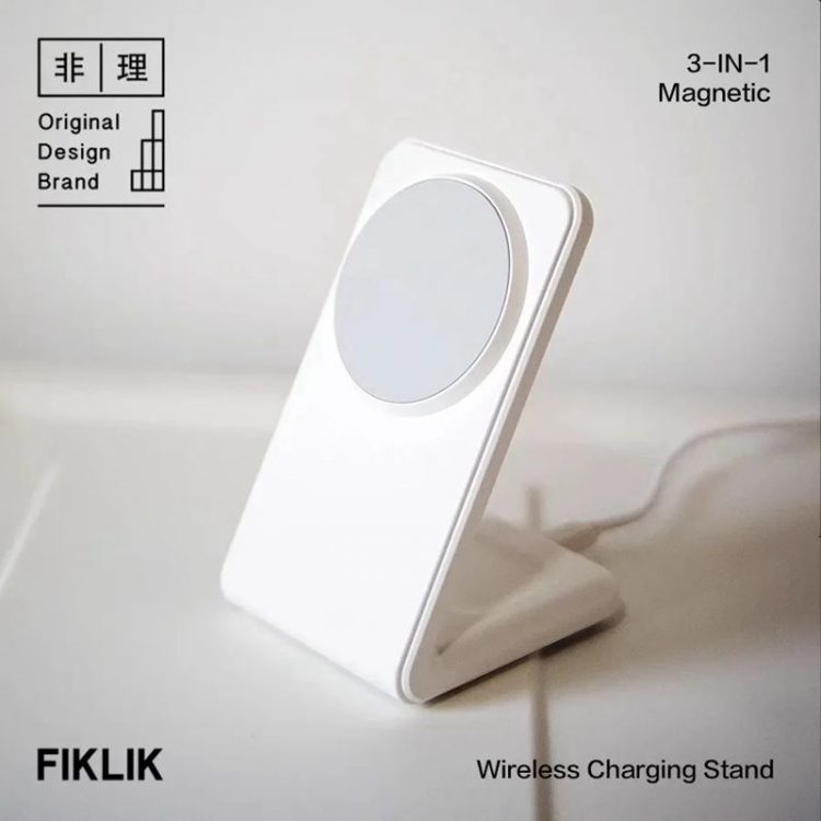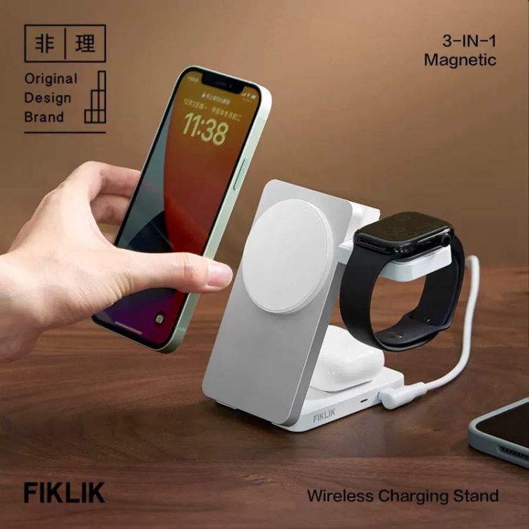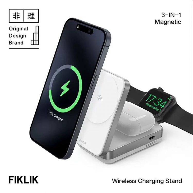 非理 FIKLIK M5 三合一无线充电器超博设计,支持 MagSafe 磁吸,可同时给苹果 iPhone、手表、耳机无线充电。
