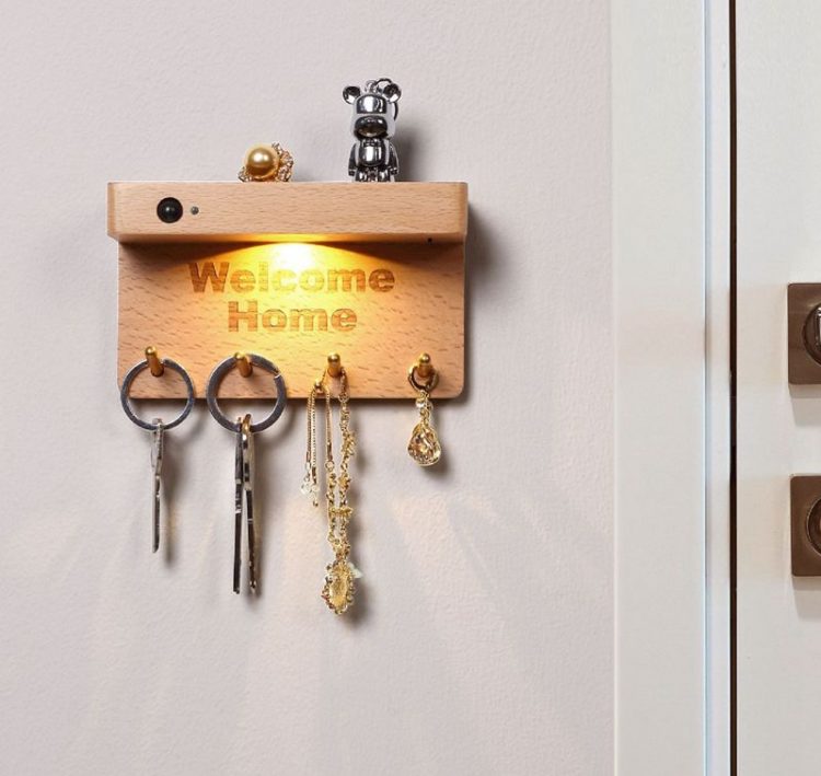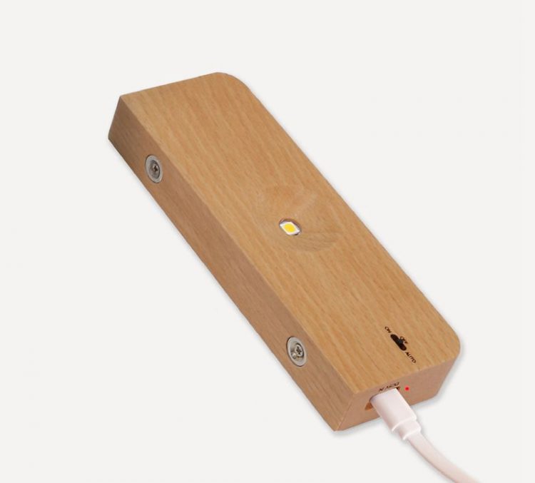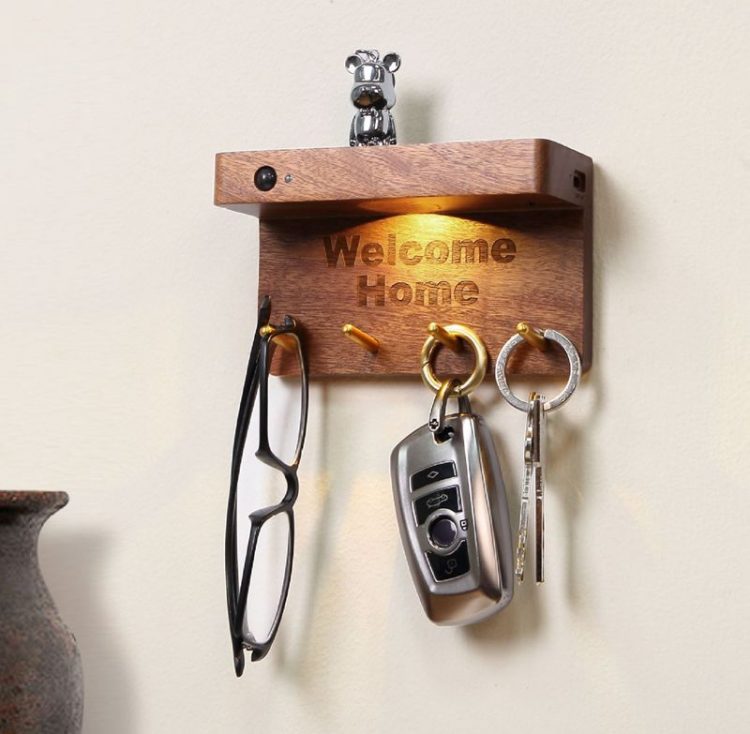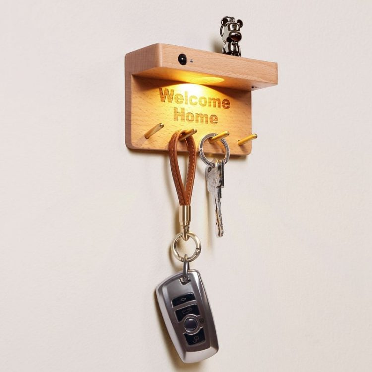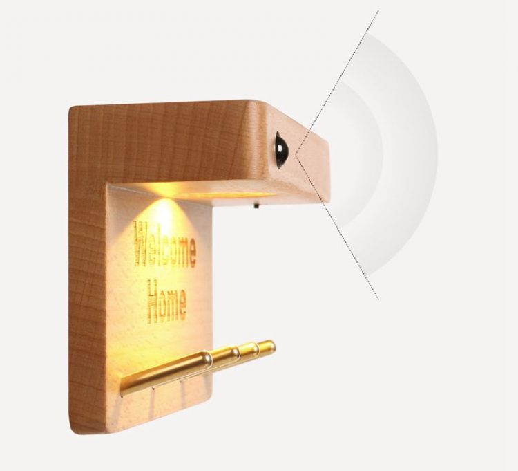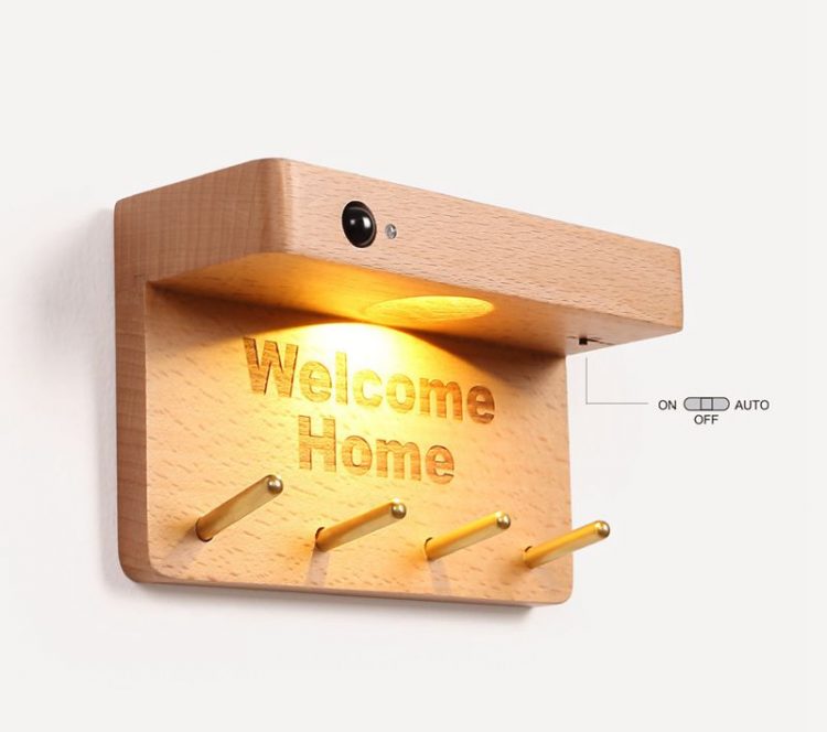 有木实木玄关钥匙挂勾支持黏贴固定在墙壁上,内置锂电,充电使用,感应亮灯,也是一个置物架,收纳随身小件物品。