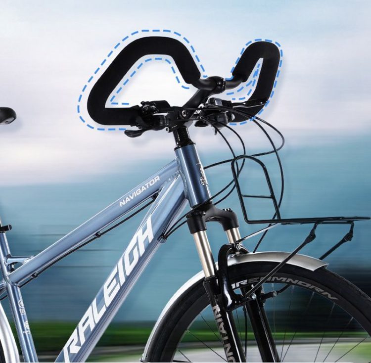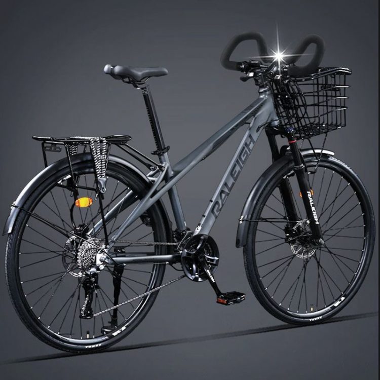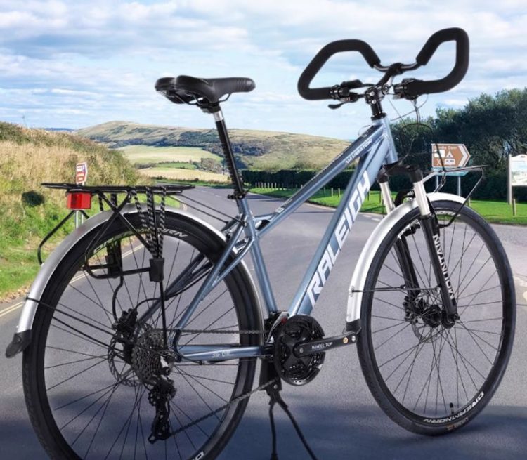 兰令 Raleigh 自行车采用铝合金车架、禧玛诺变速套件,蝴蝶握把,可变换各种骑行姿势,带前后货架,适合用作公路旅行车。