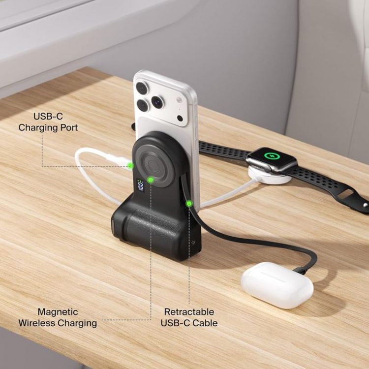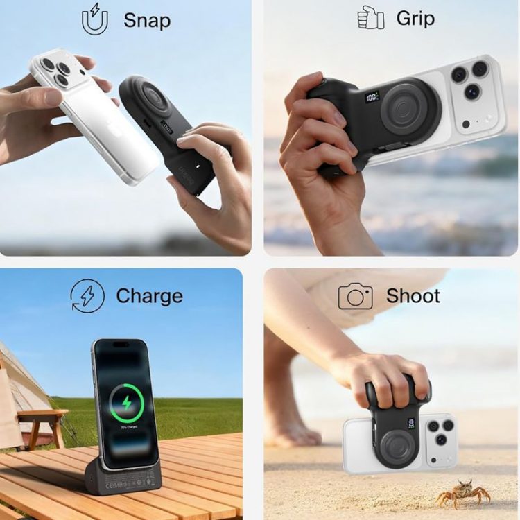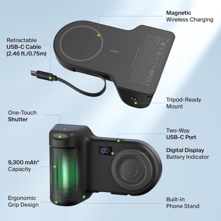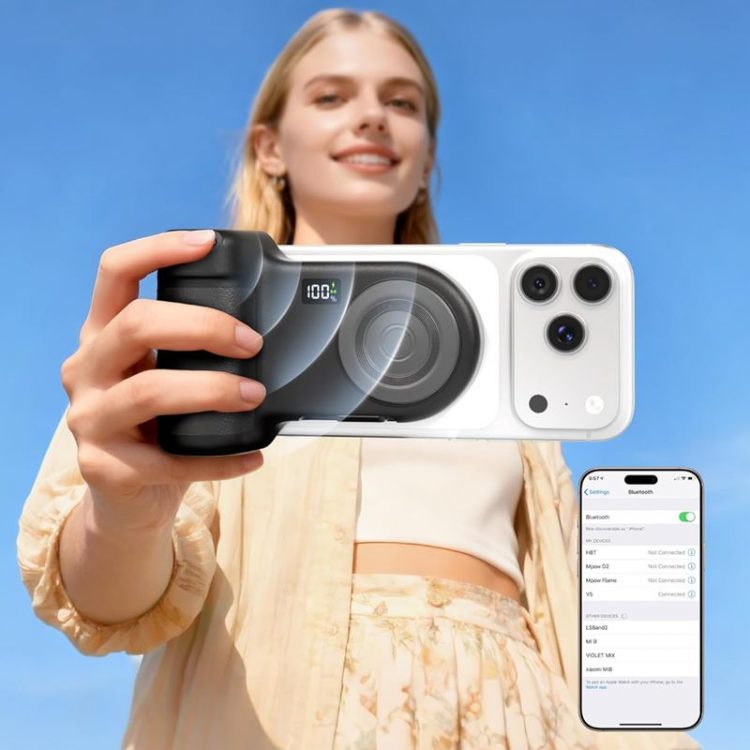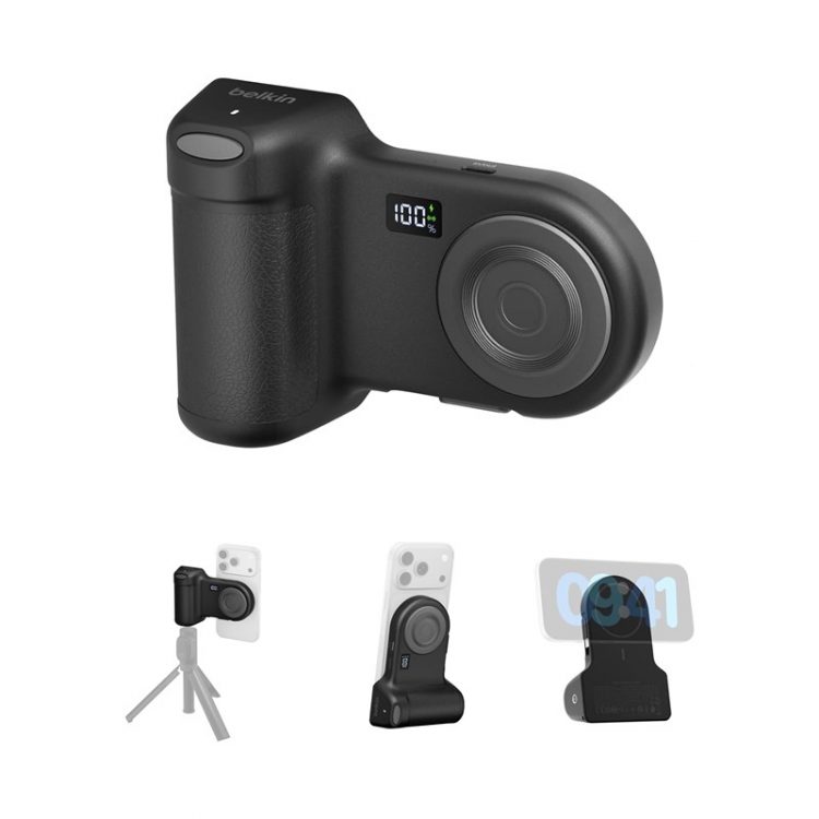 贝尔金 Belkin Stage Powergrip 手机拍照充电握把带磁吸,兼容 MagSafe,用作苹果 iPhone 手机配件,蓝牙连接,也支持 USB-C 连接,符合人体工程学设计,将您的手机变成便携式相机,方便握持取景,通过实体蓝牙快门拍摄照片、录制视频,同时可用作无线充电宝,给手机供电。带一个 LCD 屏幕,显示电量,底部设计了三脚架标准 1/4 英寸螺纹接口,方便固定拍摄。