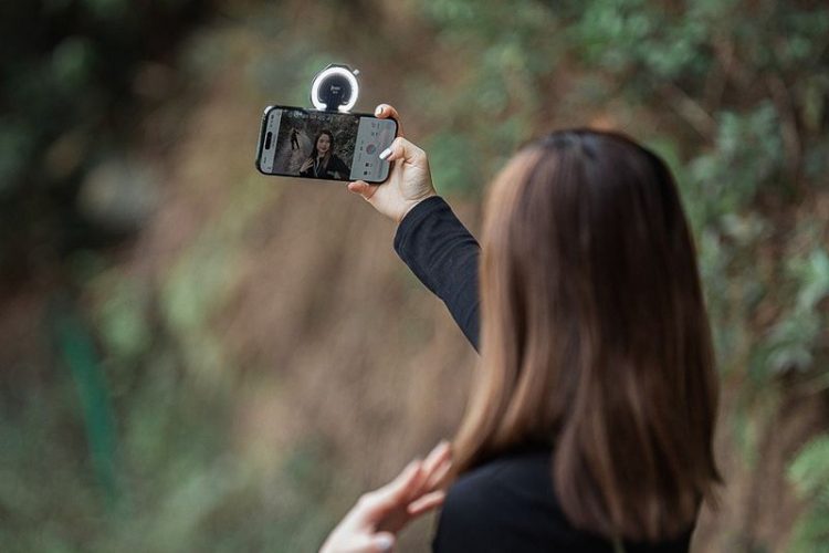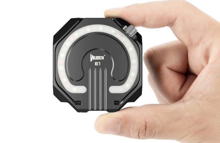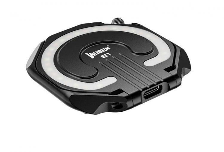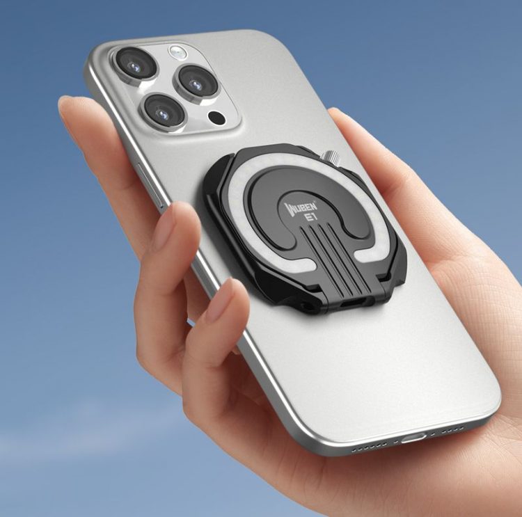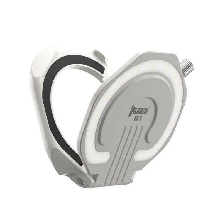 务本 WUBEN E1 手机补光灯超薄设计,方便携带,适配苹果 MagSafe,可磁吸固定在手机背面,用作手机支架/自拍补光灯,也可用作暗处照明。