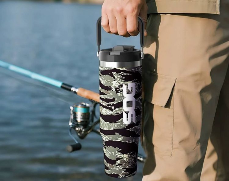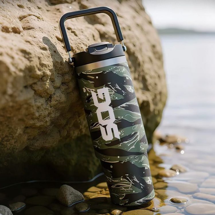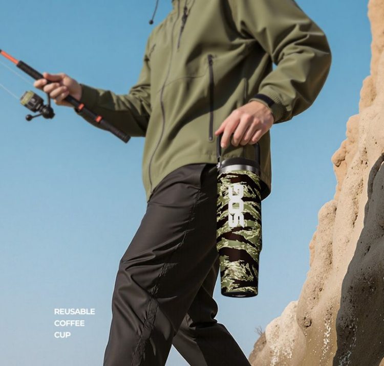 迷彩花纹车载杯带提手,双层不锈钢保温,可放入汽车水杯架,方便外出携带补水。