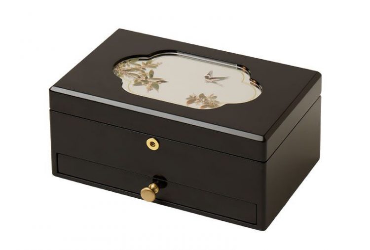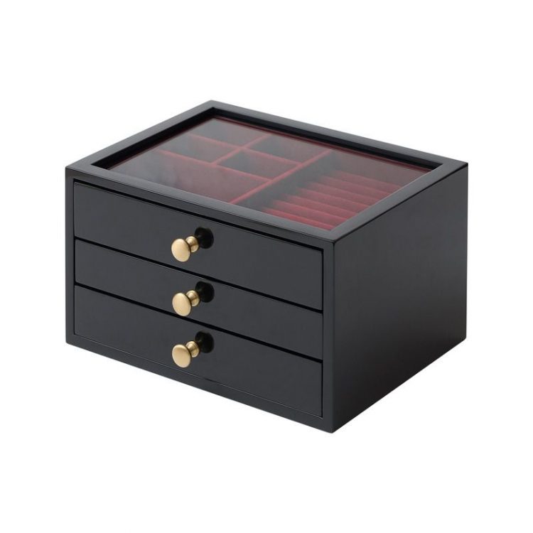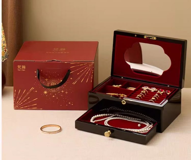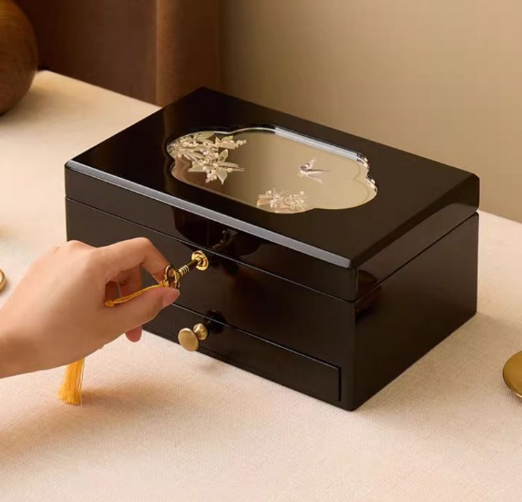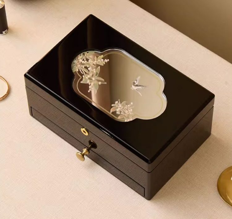 烤漆实木首饰盒简洁造型,抽屉结构,内部分格,分类收纳珠宝首饰。