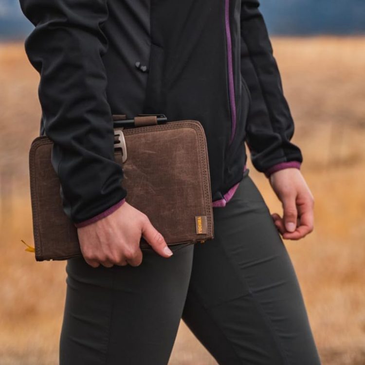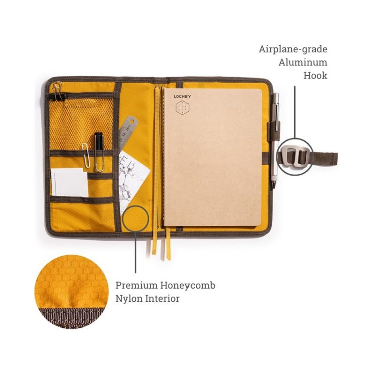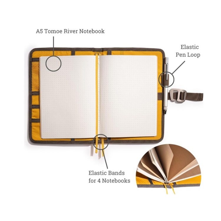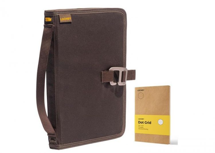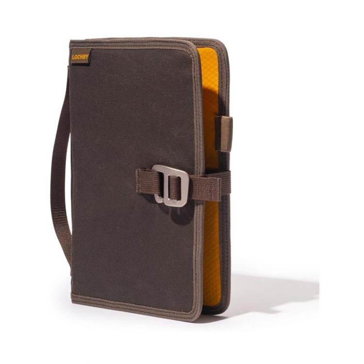 Lochby Field Journal 户外旅行记事本保护封皮采用防水蜡帆布材质,双缝线加固,铝制挂钩固定,坚固耐用,专为日常携带 (EDC) 设计,内部分为多个口袋,用于收纳名片、笔、智能手机等物品,有序分类,提升整理效率。内含一本采用 Tomoe River 纸张的笔记本,纸张克重为 68 克,白色纸张,适合钢笔书写,兼容标准 A5 内芯。是追求卓越书写体验人士的理想之选。
