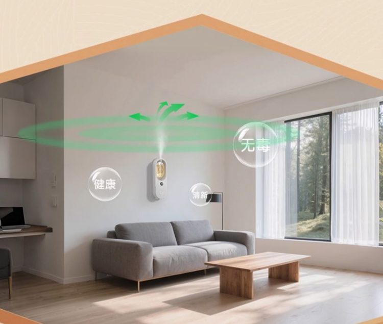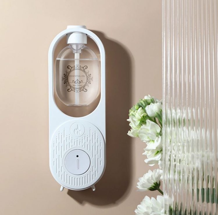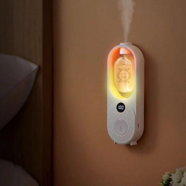 自动喷香香薰机内置锂电,超声波雾化扩香,可固定在墙壁一键启动,用作居家香氛。