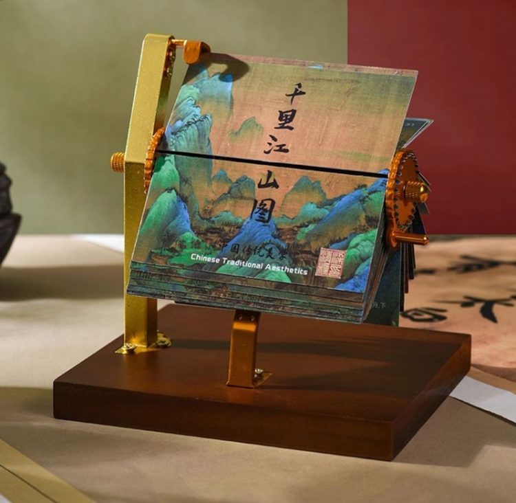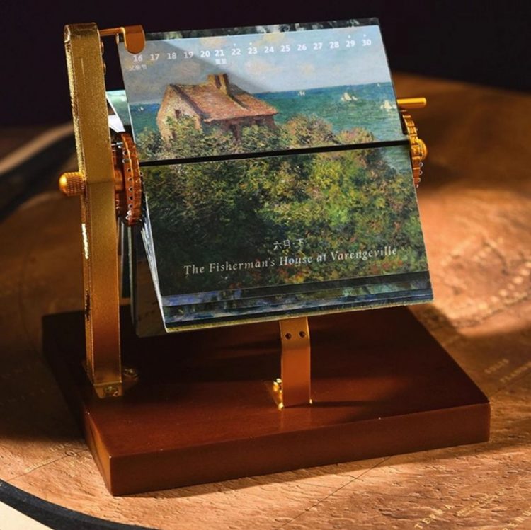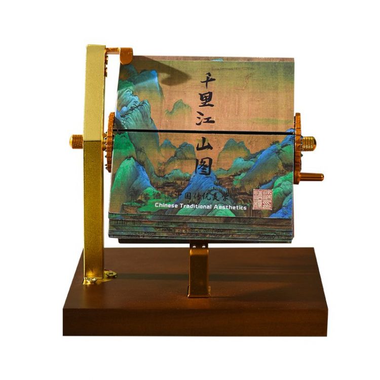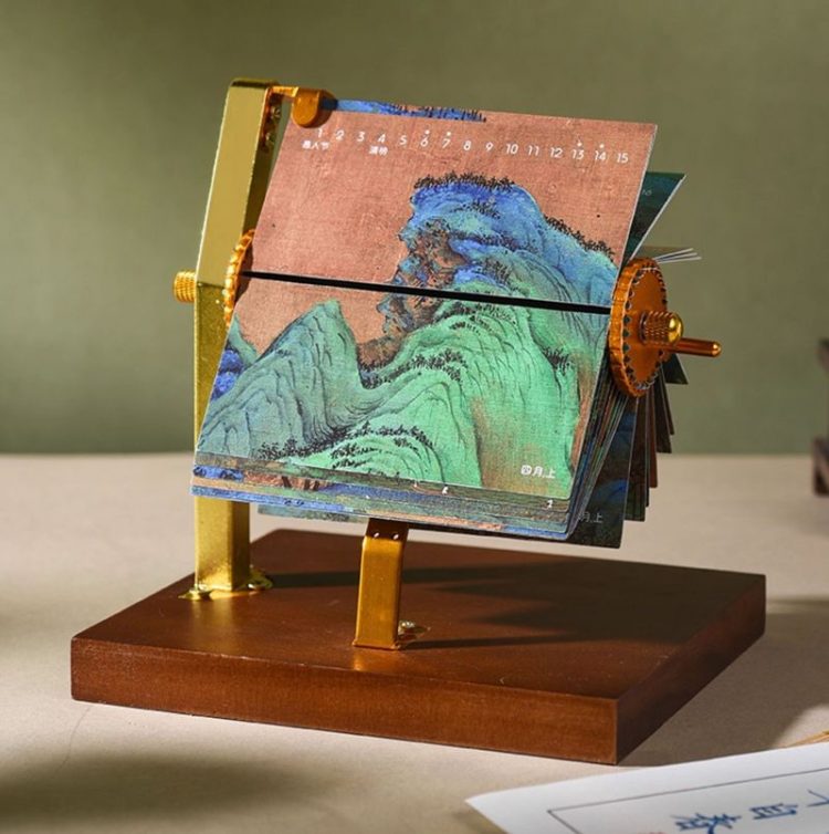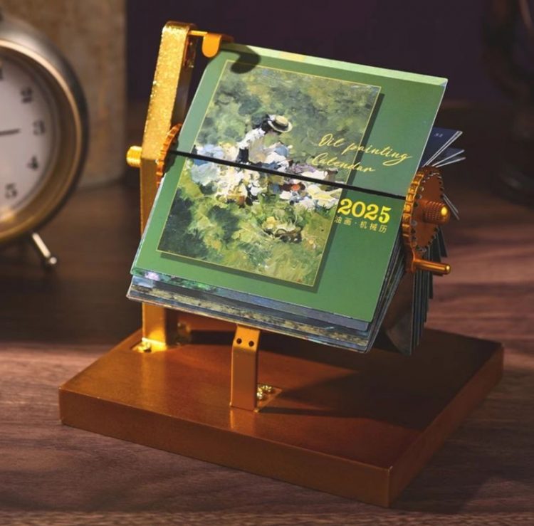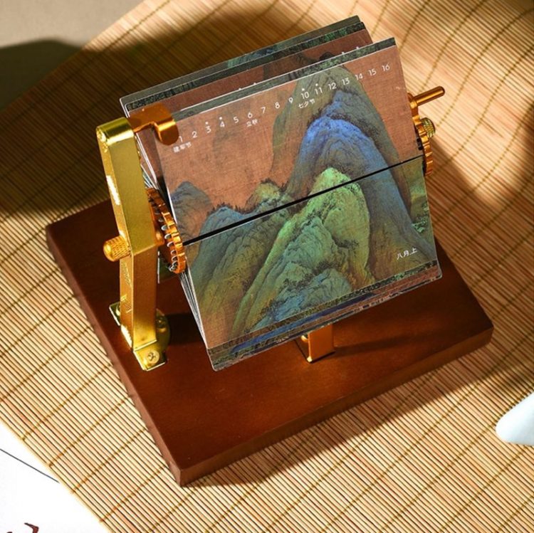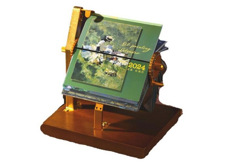 木质机械手摇台历采用精致实木底座,多种主题,手摇翻页,用作桌面摆件月历。