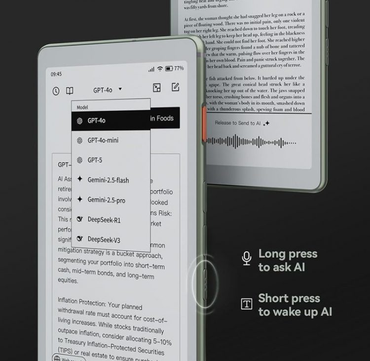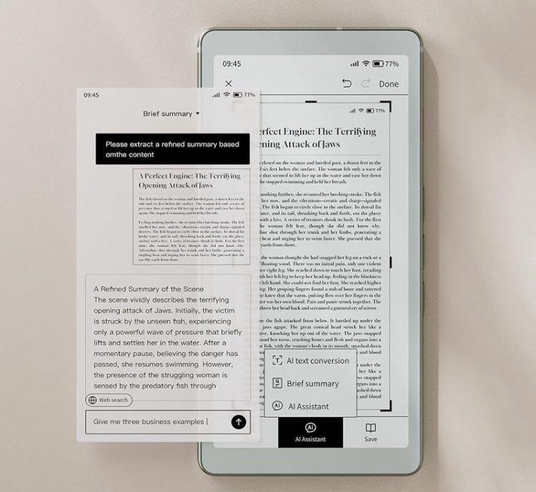 Viwoods AIPaper Reader 阅读器采用电子墨水屏,媲美纸张的触感和阅读体验,超轻超薄设计,配备 6.13 英寸小巧屏幕,方便随身携带,侧面设计了AI 按钮,轻松访问 AI 助手,完美兼顾便携性和易用性,提供快速解决方案、学习工具或实用摘要,随时随地享受阅读乐趣。