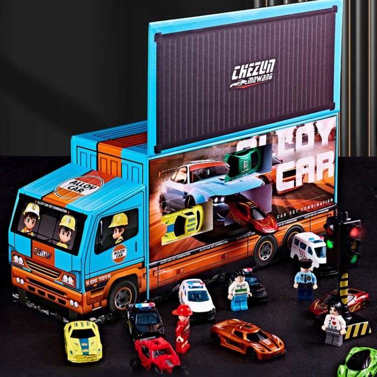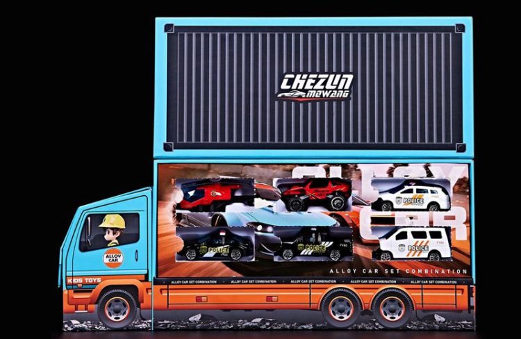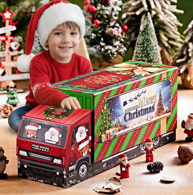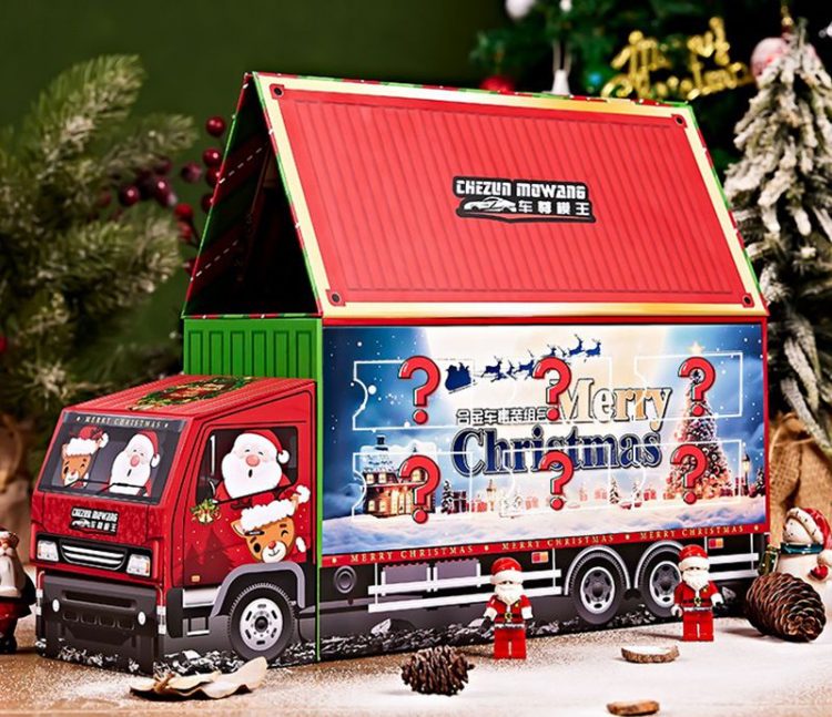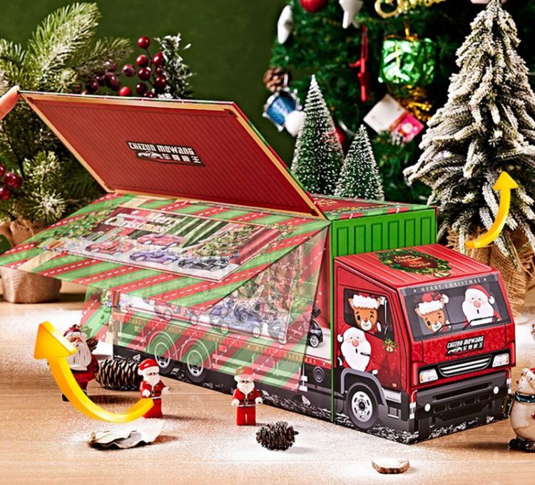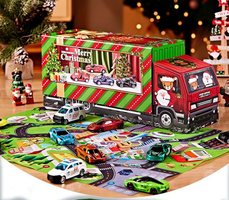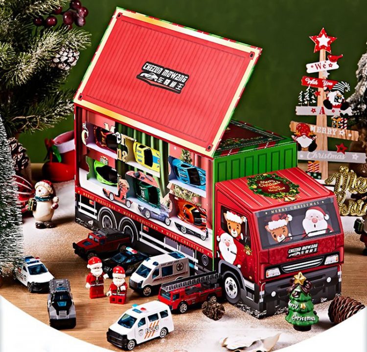 帕龙洞洞乐合金小汽车套装外包装是一个圣诞老人开的集装箱大货车,每个空间都藏着一辆合金小车,五种车型,立体礼盒,满足孩子的开箱盲盒乐趣。