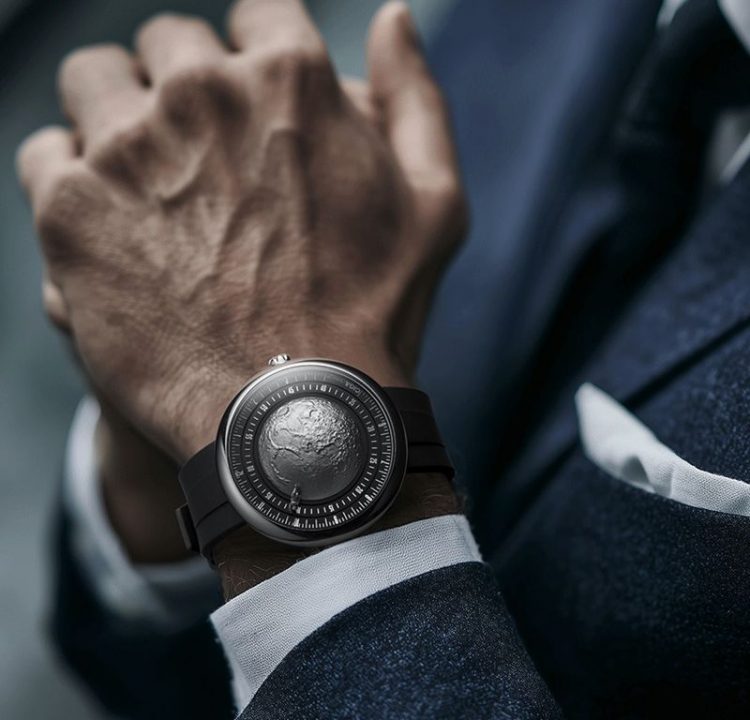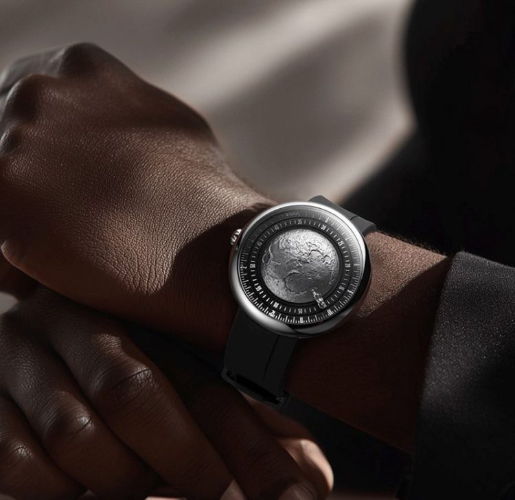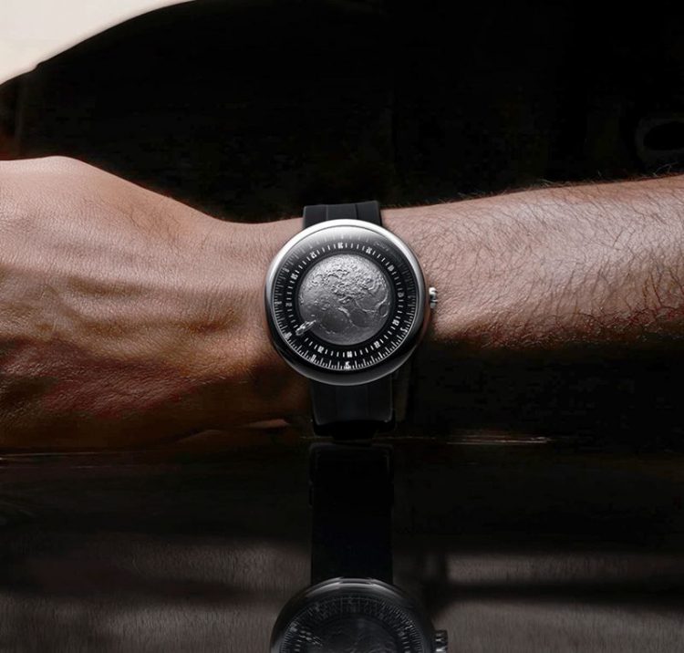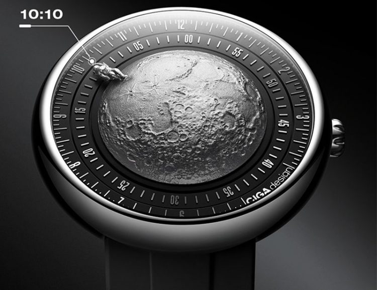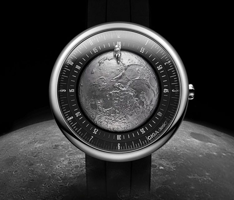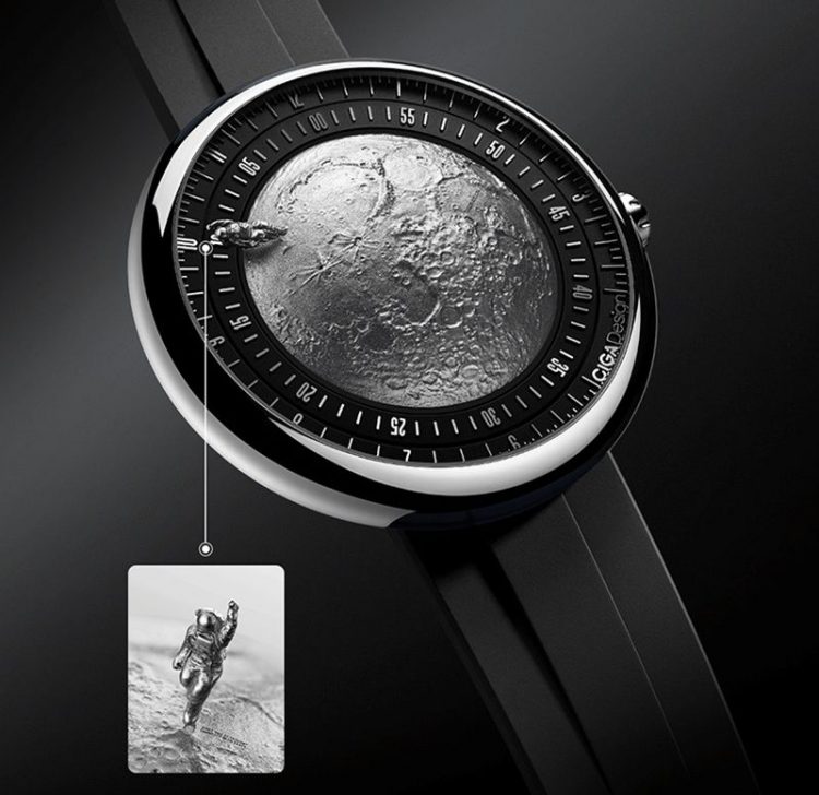 玺佳 CIGA design 探月者艺术腕表采用钛合金表壳,还原月球表面 CNC 雕刻表盘,微型宇航员取代了指针,重现人类登月壮举。