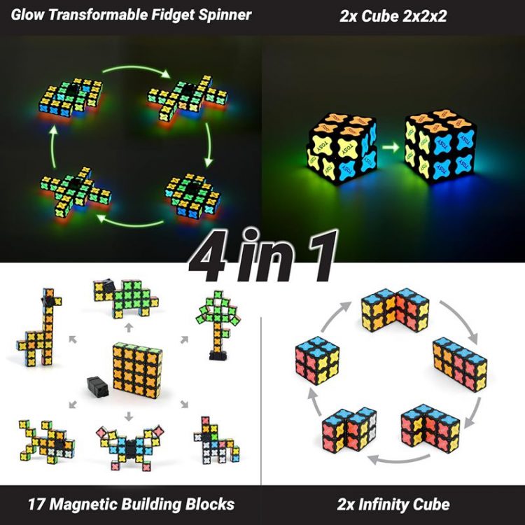TOSY 磁力指尖陀螺发光款包括 17 块夜光立方体积木,内置 136 个磁铁(每个模块嵌入 8 个),可以磁吸固定拼搭出超过 10000 种不同形状的指尖陀螺,配合不锈钢轴承,旋转顺畅,附带紫外线手电筒,照射后,便可发出光芒。通过翻转、折叠、转动,有助于缓解压力和焦虑,提高专注力,并增强灵活性。