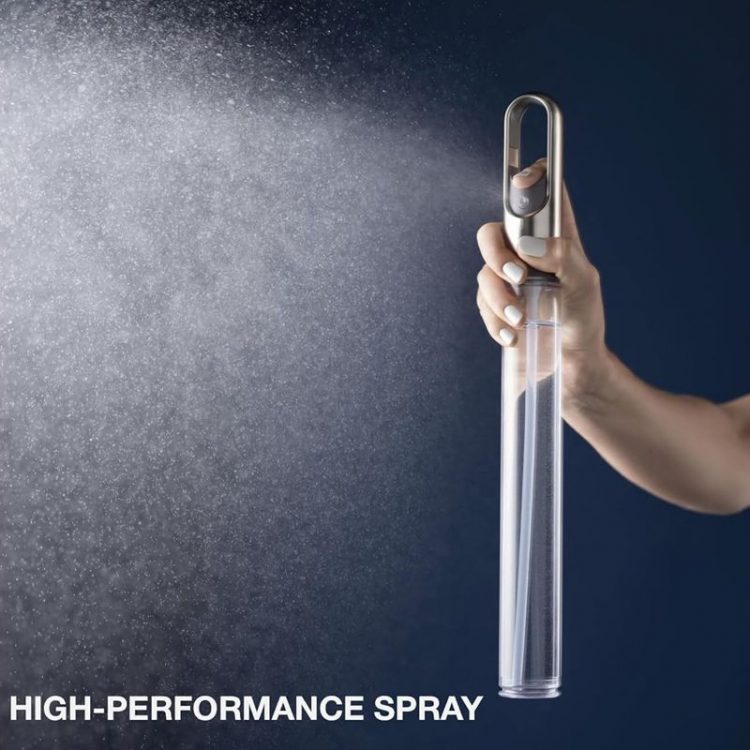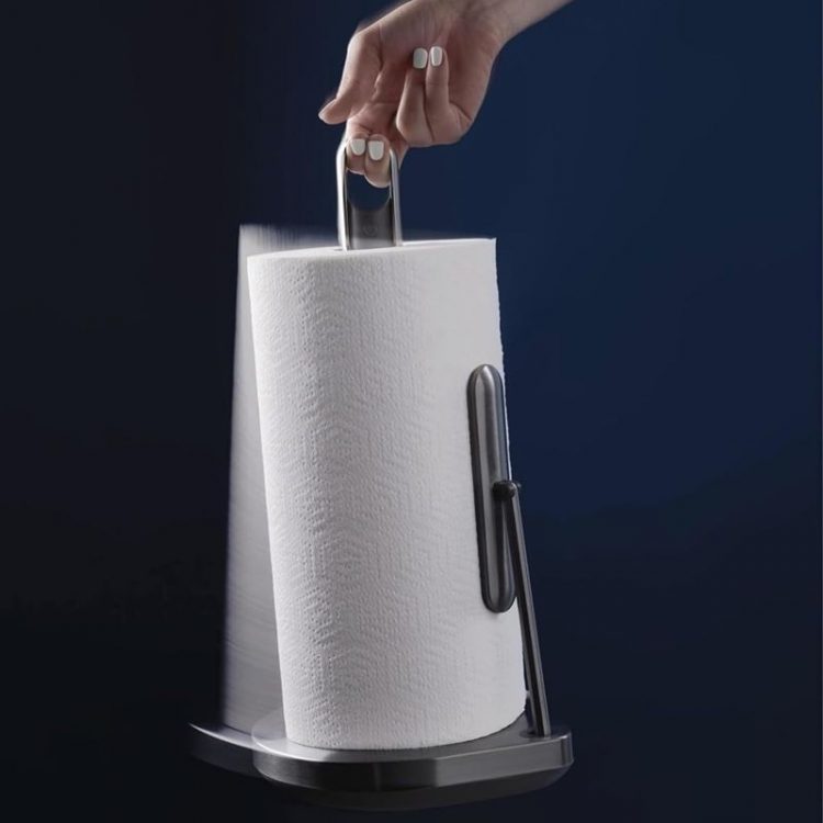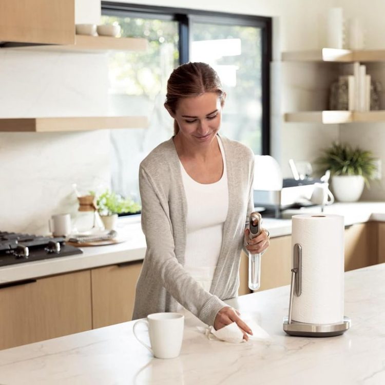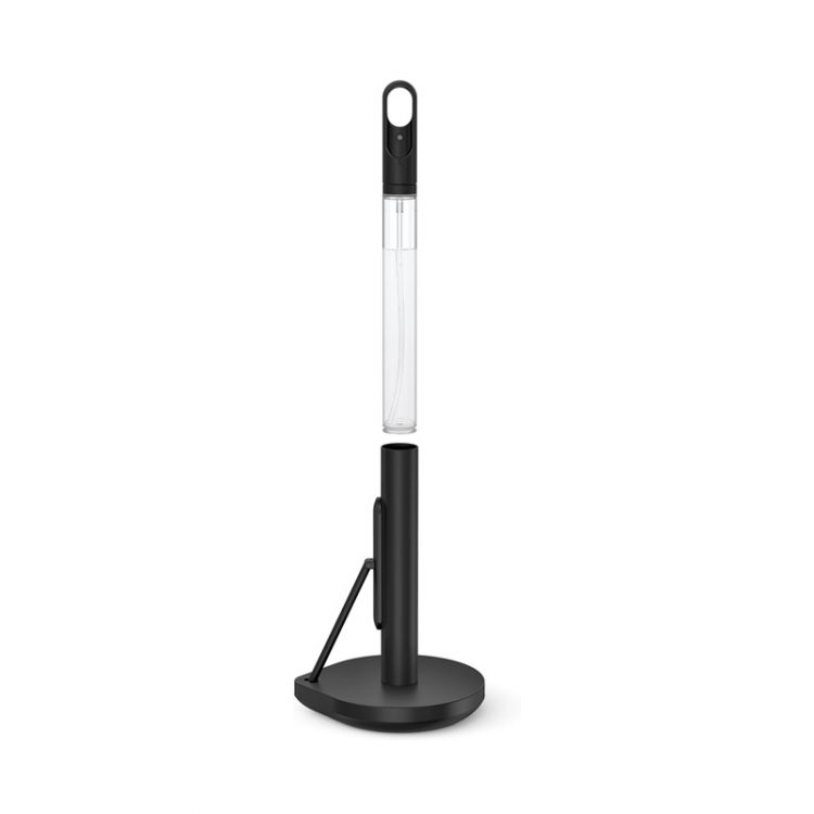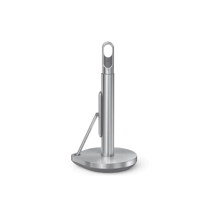 SimpleHuman 不锈钢立式厨房纸巾架集成按压喷雾泵,内置清洁剂、洗洁精,一按喷洒,快速覆盖污垢,方便使用一次性厨房纸巾擦拭清洁。纸巾架设计了弹簧张力臂,压紧卷纸,既可防止厨房卷筒纸散开,也方便单手撕纸。