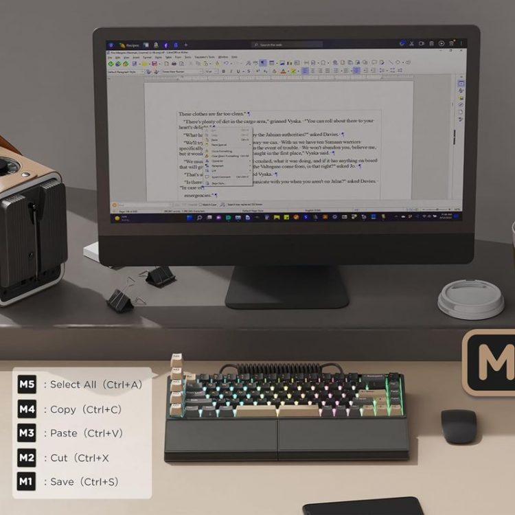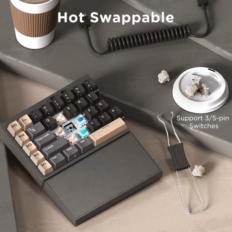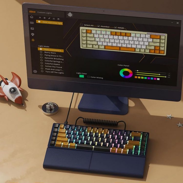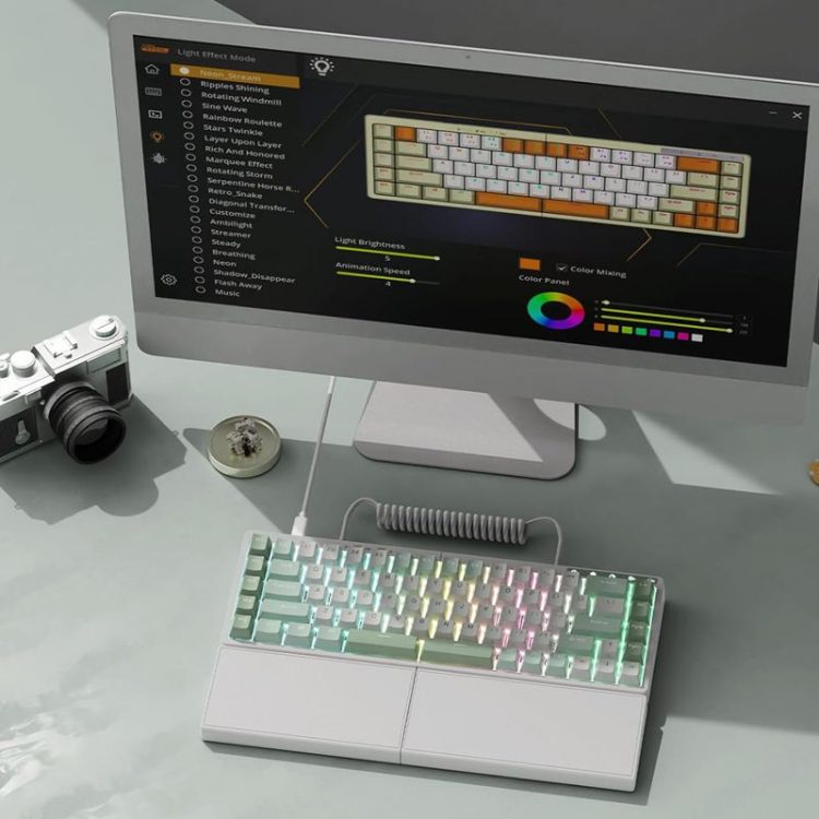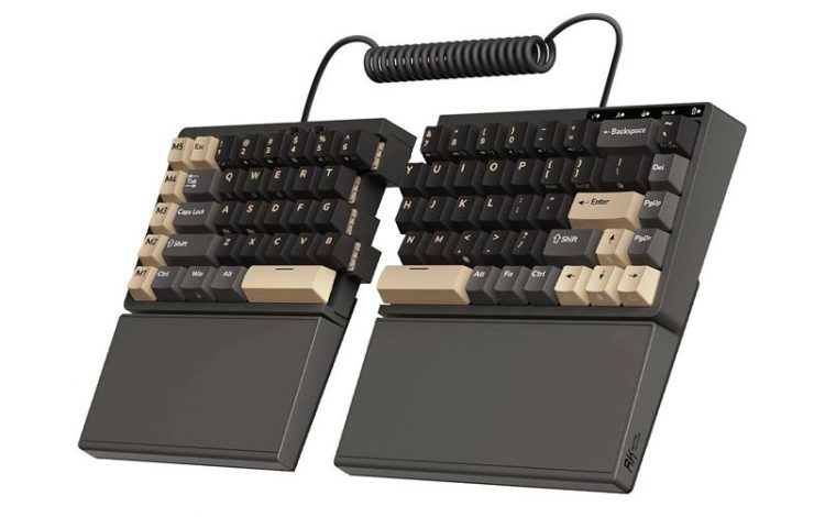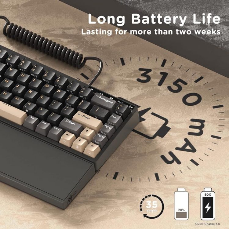 ROYAL KLUDGE RKS70 机械键盘采用 75% 紧凑布局,支持热插拔键轴,带 RGB 背光灯效,人体工学分体式设计,支持低延迟2.4GHz、蓝牙和USB-C三模连接,左右分体螺旋线缆连接,配备 8 个可调节支脚,自由调节键盘远近和倾斜角度,带固定式碗托,打字时支撑手腕,避免劳损,左侧内置电池,配备 5 个可编程宏按键,支持左手单手操作,右手操控鼠标,非常适合游戏玩家、程序员和作家。