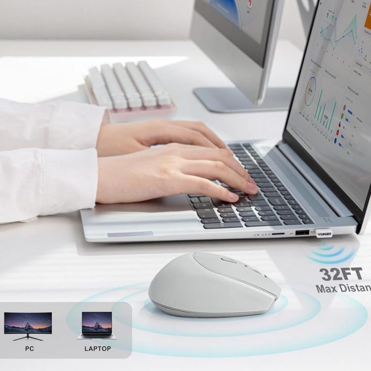 键设宇宙 YUNZII C2 鼠标硅胶材质外壳,人体工学设计,握持舒适,2.4G 无线连接电脑,3 档可调 1600 DPI 光学追踪,静音点击,适合办公使用。