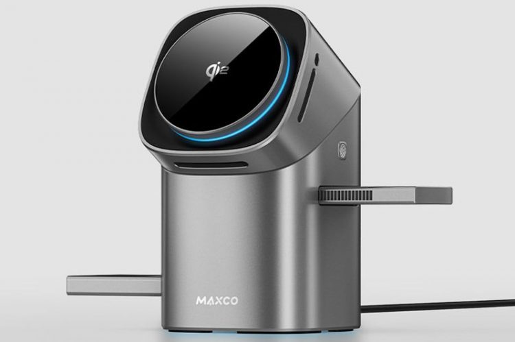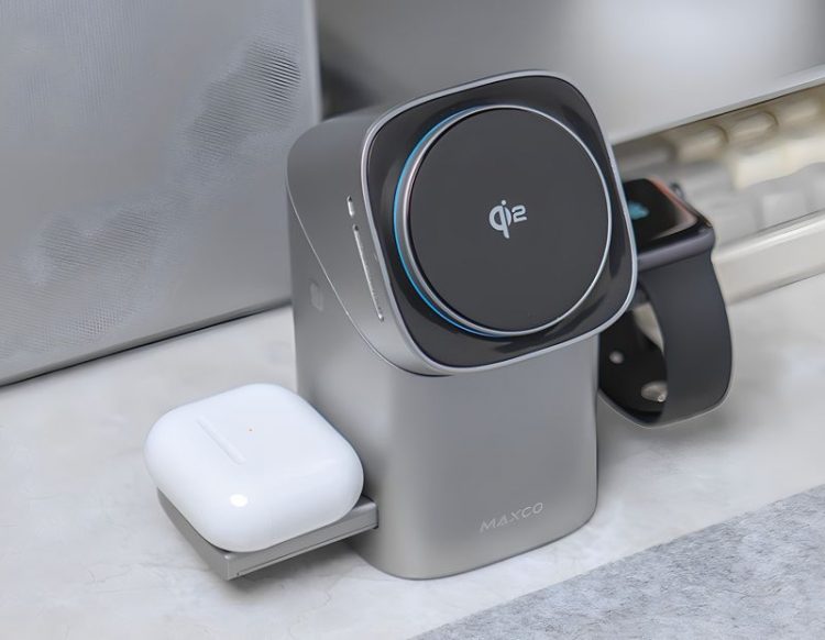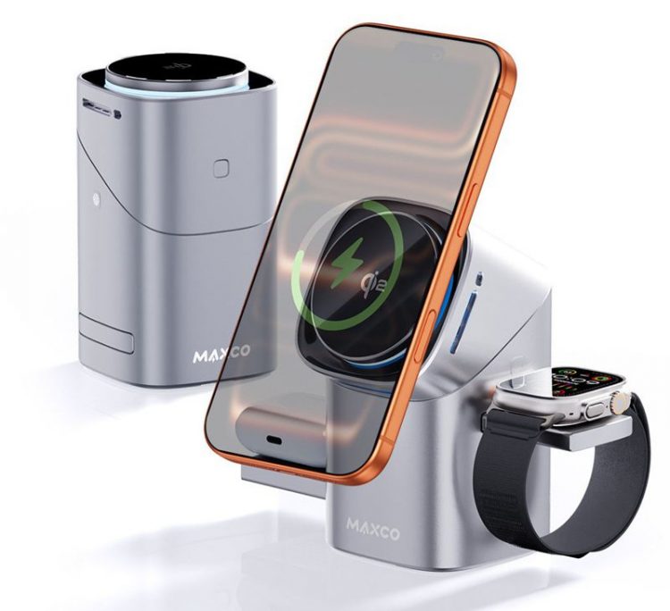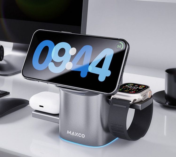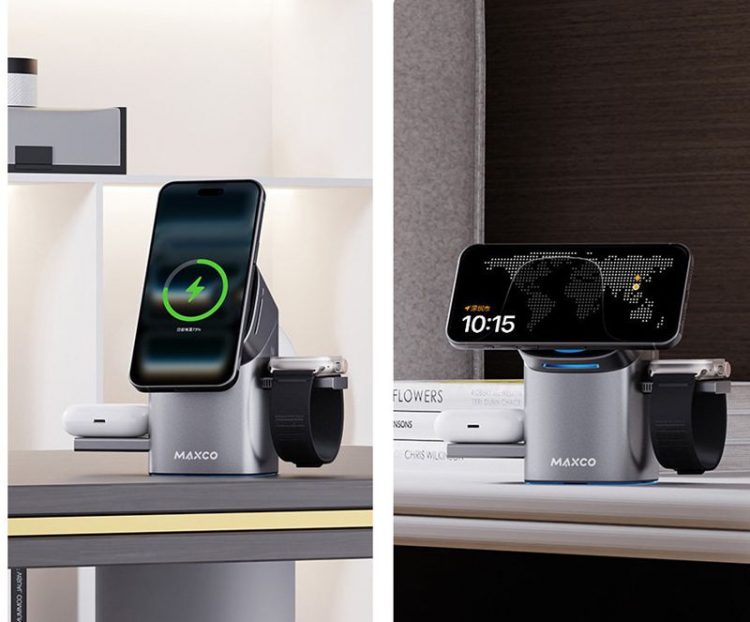 美能格 MAXCO 三合一磁吸桌面无线充电器打开后,可用作苹果三件套手机、手表、耳机同时充电,支持 Qi2 无线快充,同时也是桌面支架。