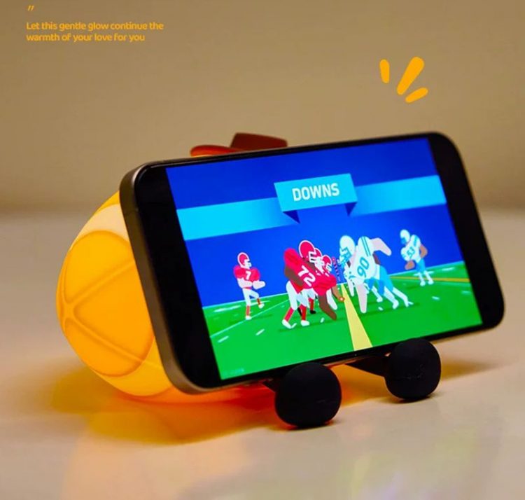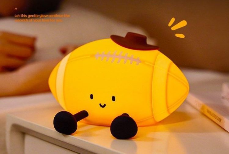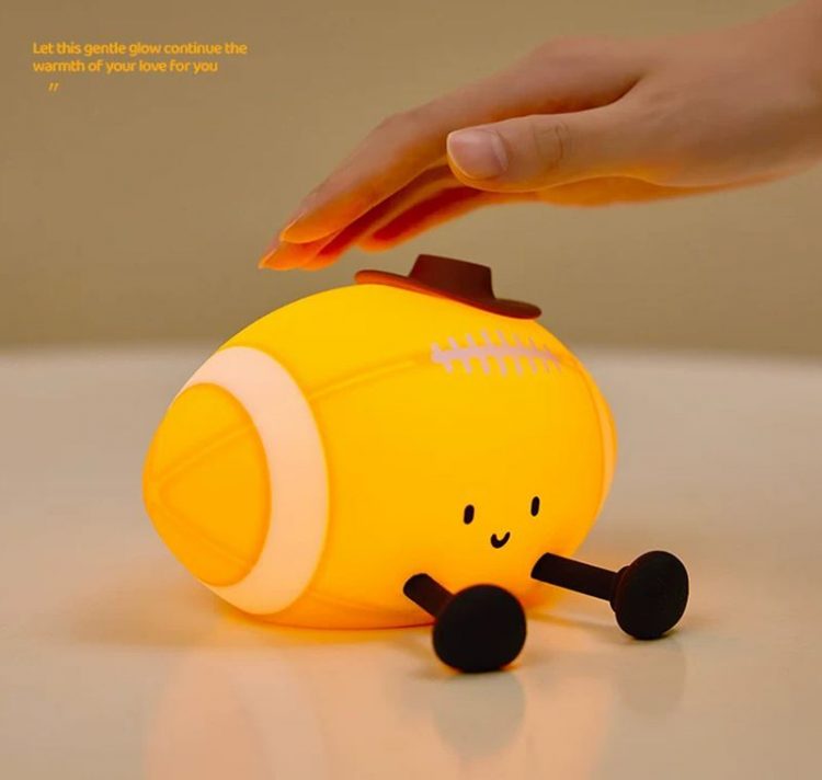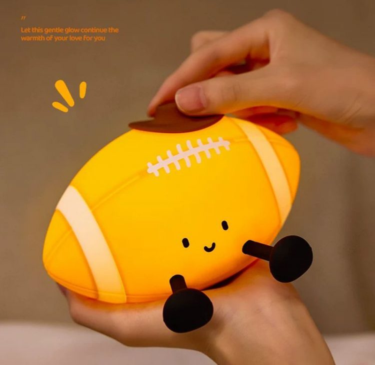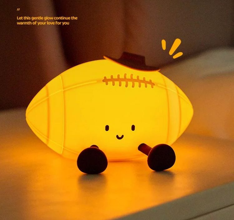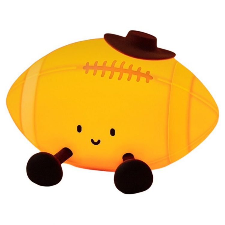 小夜灯硅胶材质,卡通橄榄球造型,拍打亮灯,延迟关灯,用作床头灯,也可用作手机桌面支架。