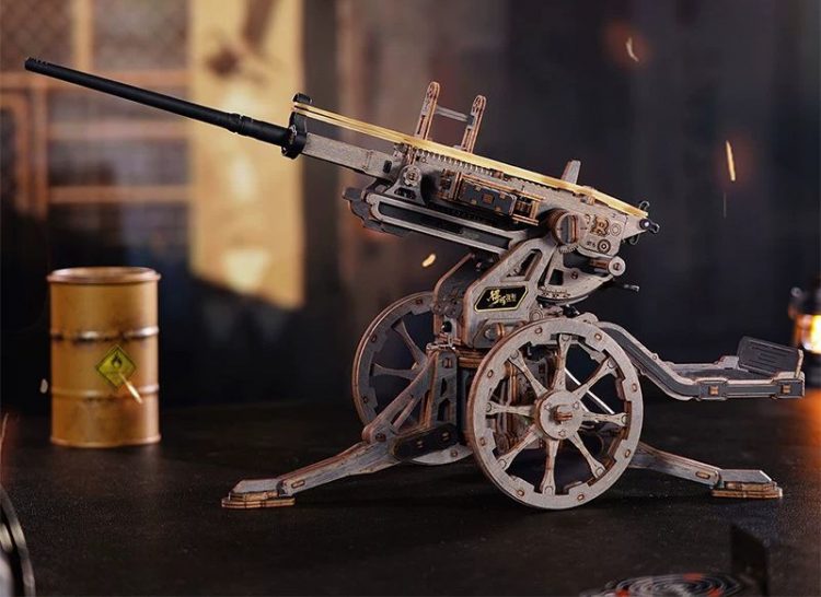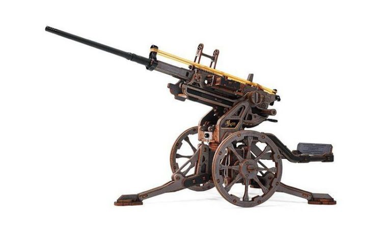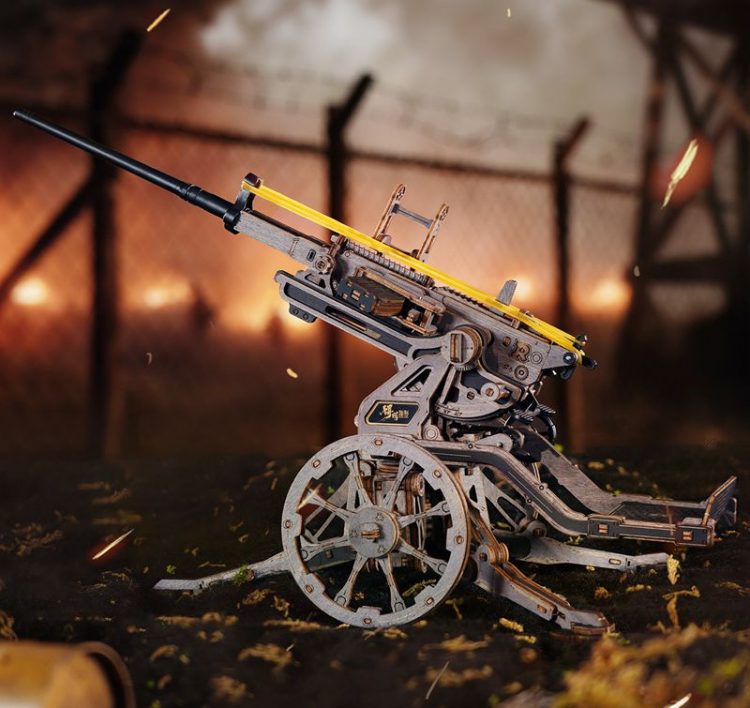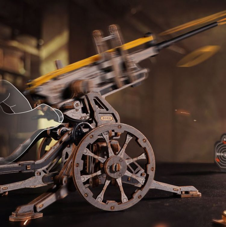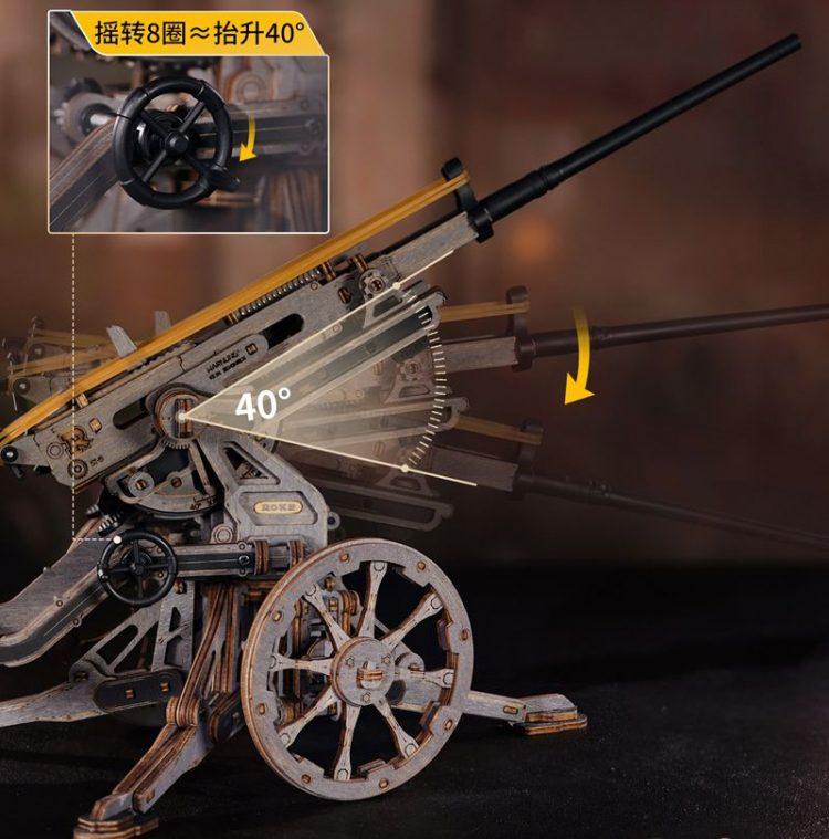 若客 ROKR 苏罗通高射炮复刻经典 ST-5 防空武器,采用木质激光切割组件,榫卯结构,拼装完成后,模拟发射,可一次发射五发皮筋弹药。