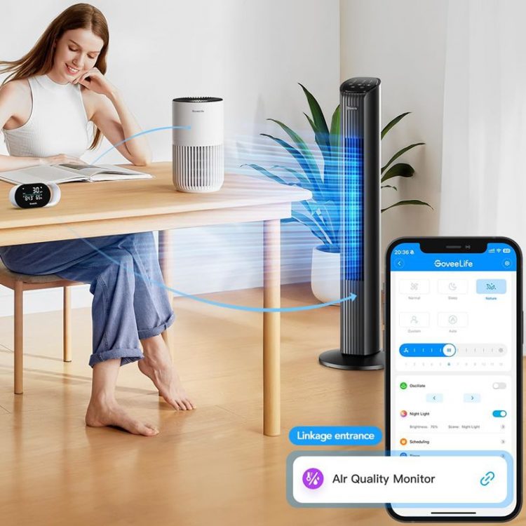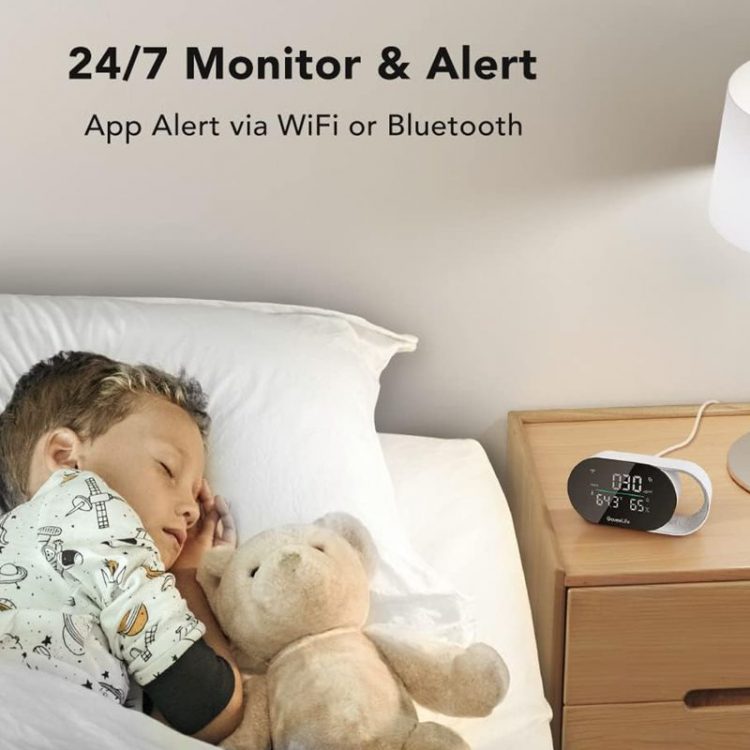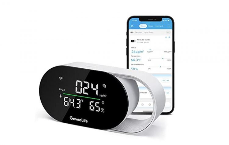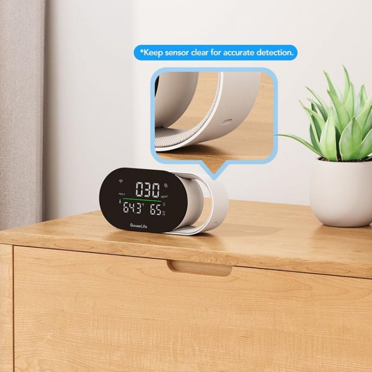 GoveeLife 智能空气质量检测仪适合家庭和办公室使用,自带 LED 显示屏,记录室内 PM2.5、温湿度,2 秒刷新率,按顶部按钮切换显示时钟 / PM2.5 值。长按 2 秒可切换至明亮屏幕模式/夜间模式,LED 指示灯显示 4 个级别的环境空气质量。