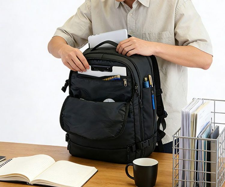 旅行双肩包防水面料,可扩容,科学分类收纳,取放方便,用于通勤、差旅。