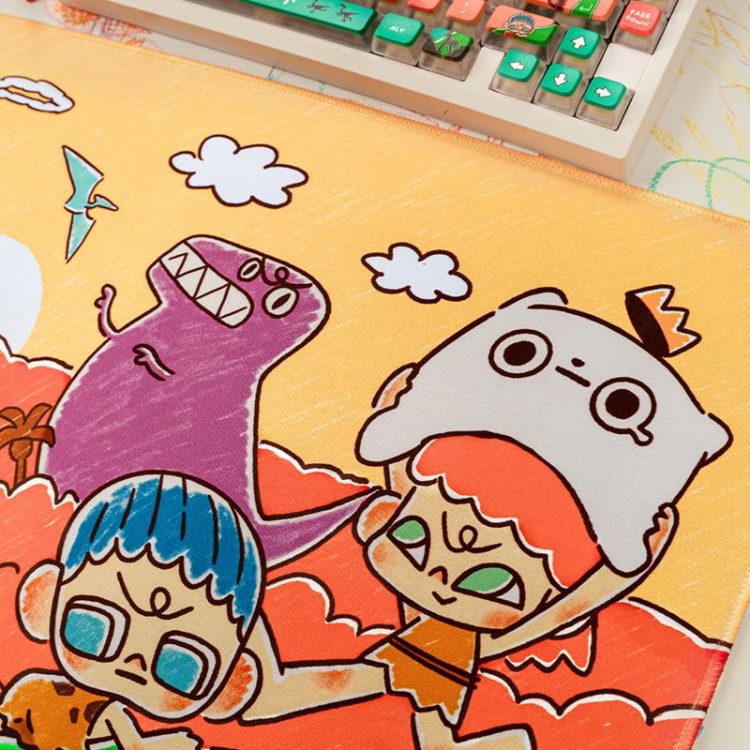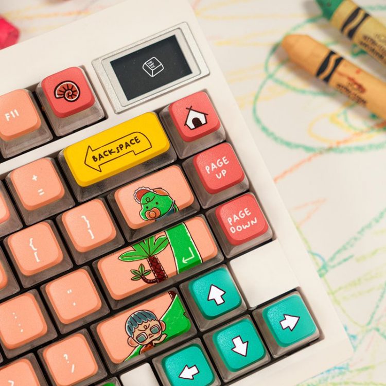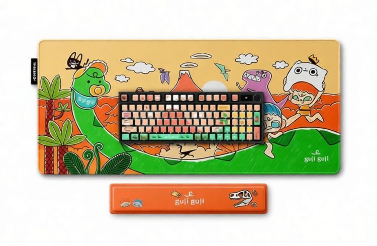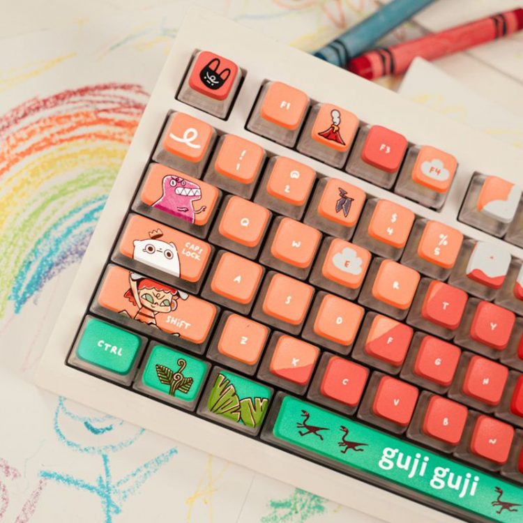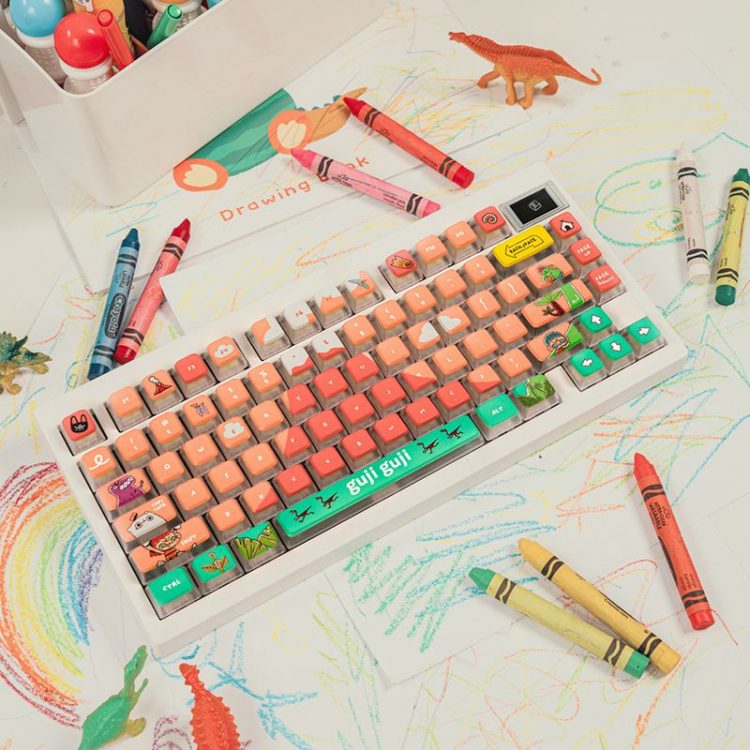 Thekapco x Guji Guji 《咕咕咕》联名款重返侏罗纪机械键盘将艺术和创造力融入工作,采用经典漫画形象,114 按键, PBT 材质键帽,热升华图案,标准 ANSI 布局,右上角设有LCD 智能显示屏(电池、日期、时间和连接 | Thekapco 动画)及多媒体旋钮,支持热插拔键轴,三模(蓝牙、2.4Ghz、Type-C 有线)连接设备,让您的工作空间充满活力,带来更多欢乐。