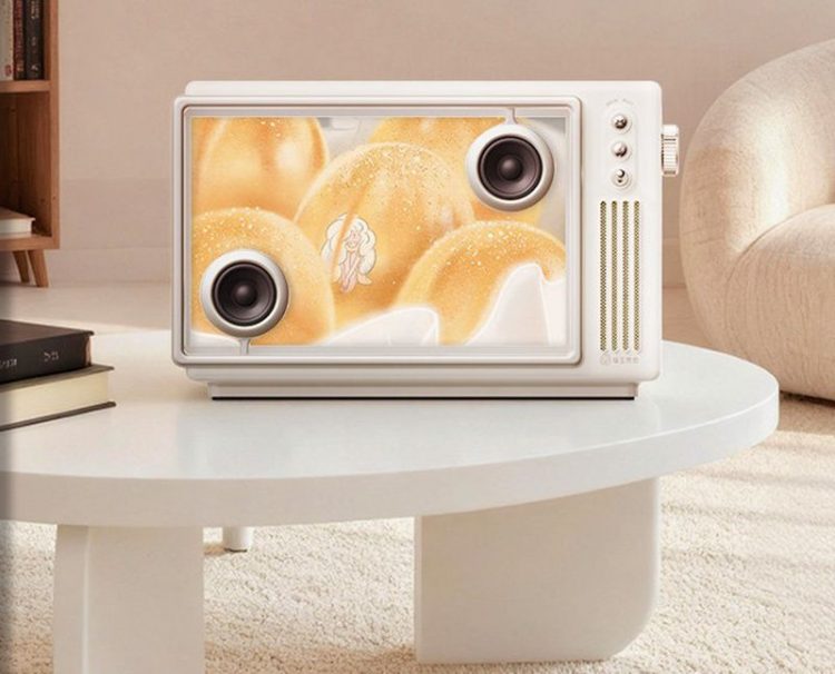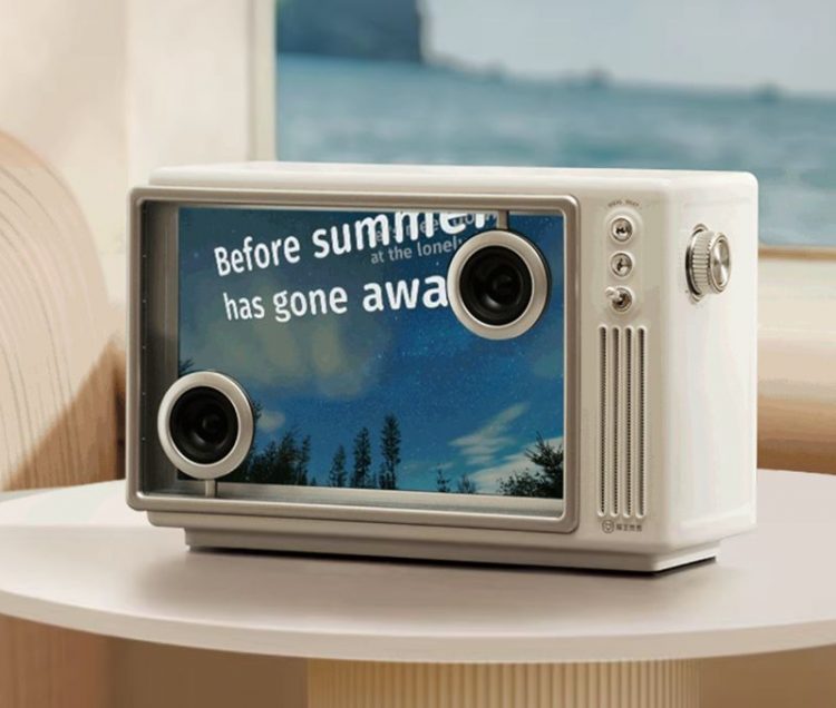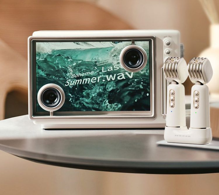 猫王音响 Muzen 悬浮歌词蓝牙音箱支持动态背景和歌词,配备 K歌麦克风,支持多种音效,用作家庭娱乐。