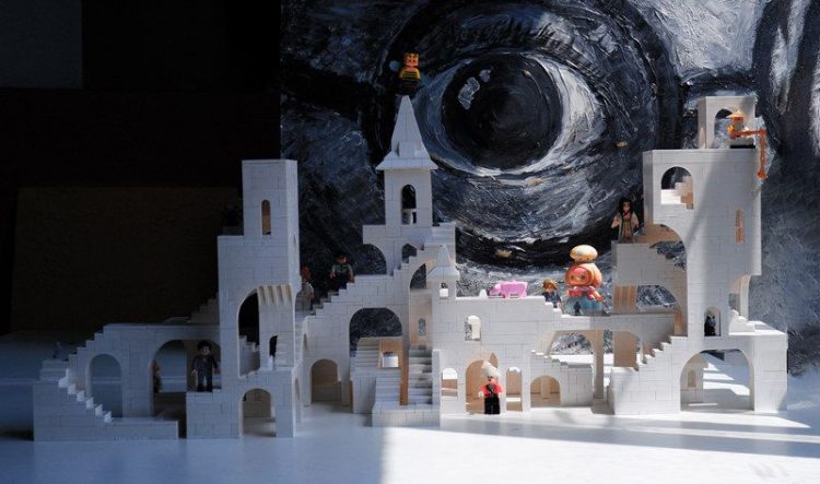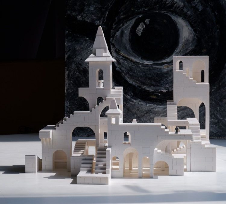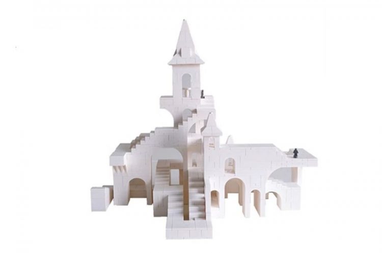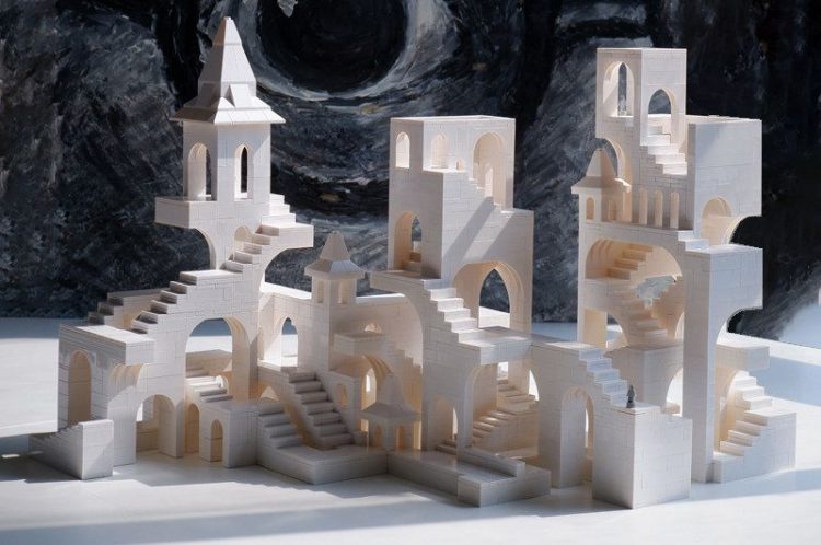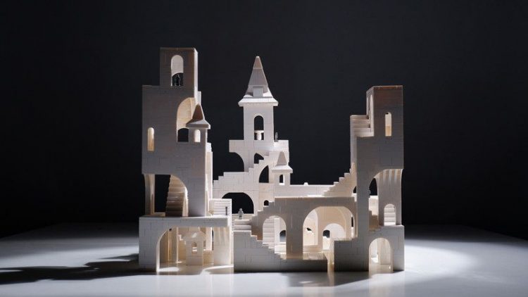 玩佳砖块城堡用白色积木颗粒拼搭完成,复刻《纪念碑谷》游戏场景,治愈解压,完成后,用作桌面摆件。