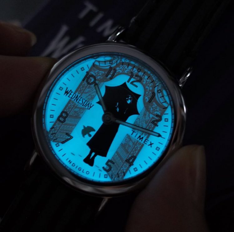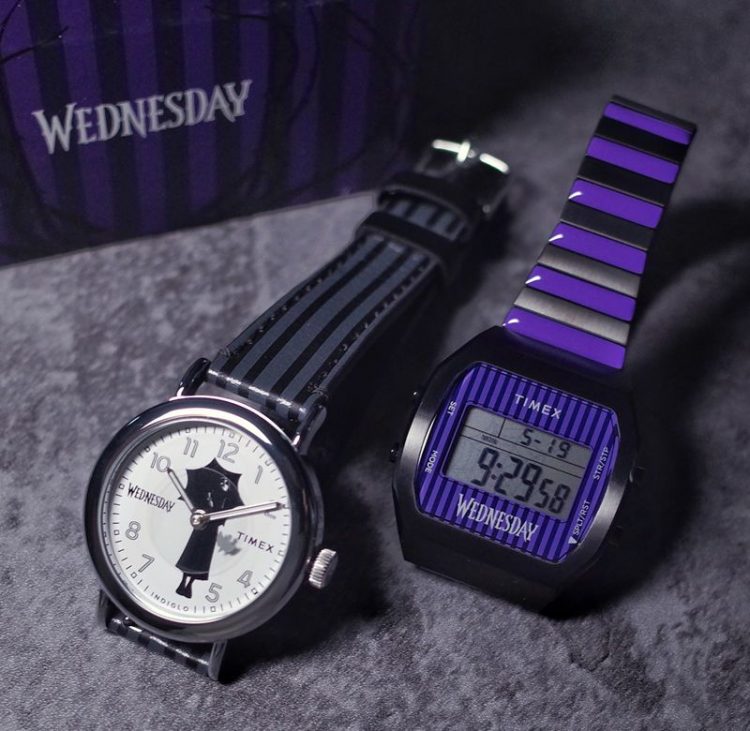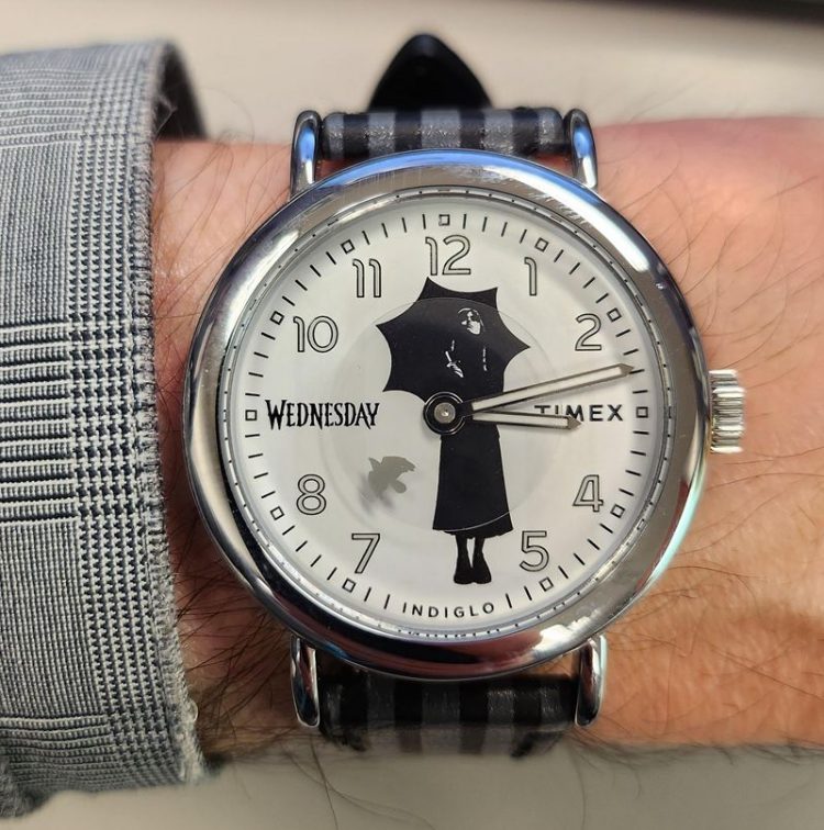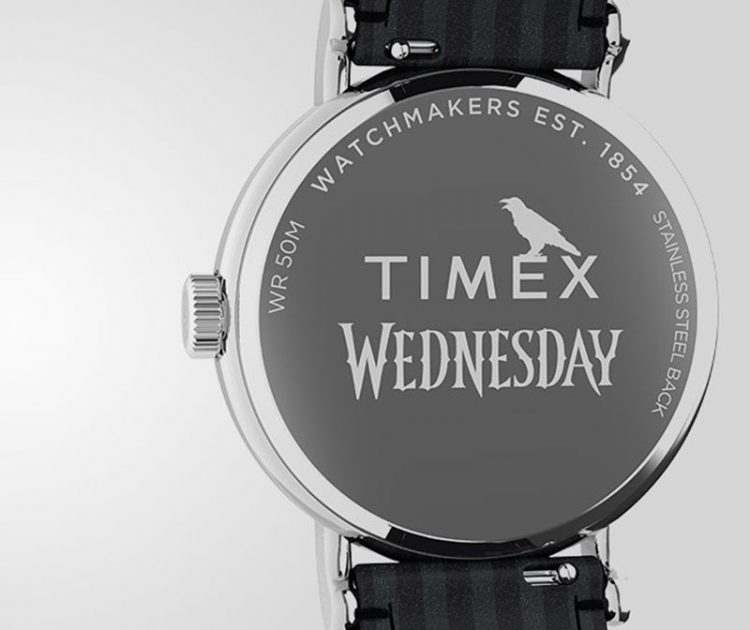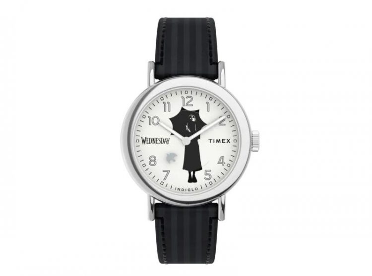 天美时 TIMEX 美剧星期三 Wednesday 联名手表采用暗黑哥特风表盘,石英机芯,真皮表带,带夜光,电视剧迷佩戴。