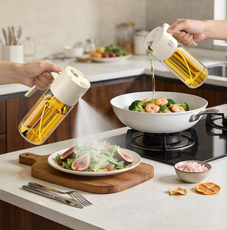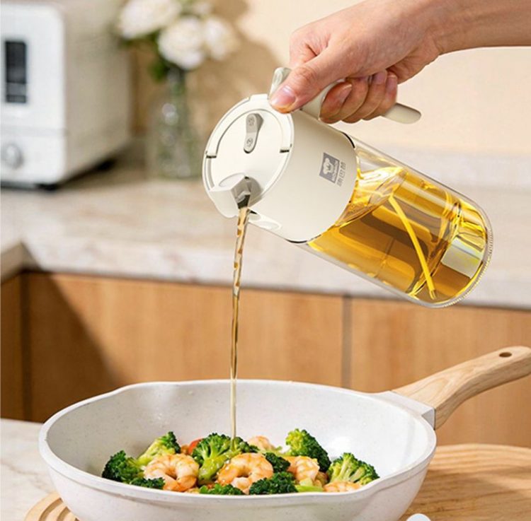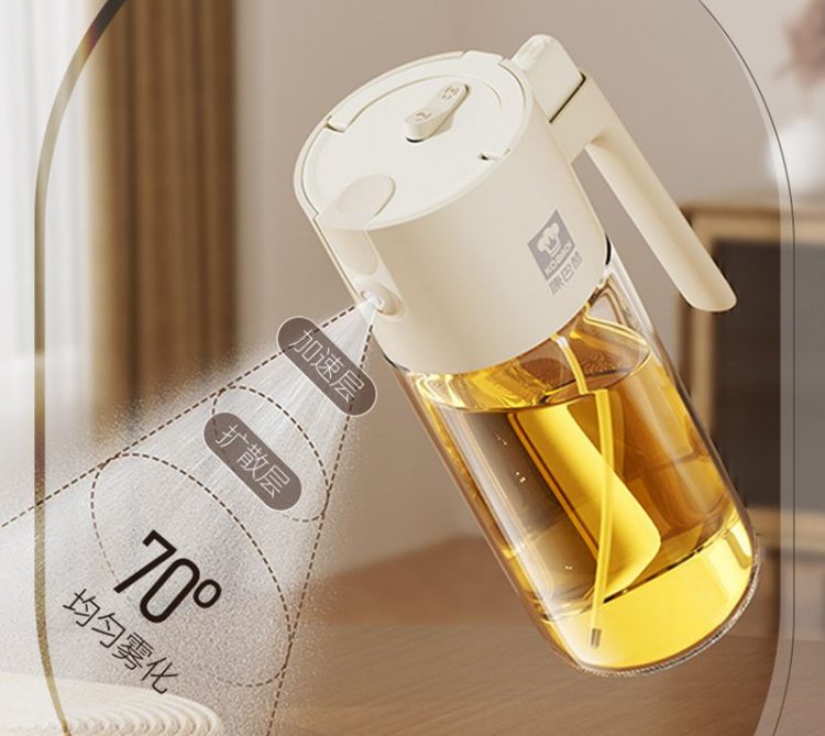 喷倒两用油壶不用开盖,按压喷雾,重力倒油,精准控油,减少油脂摄入。