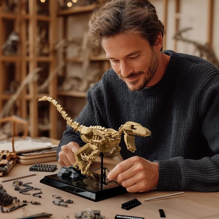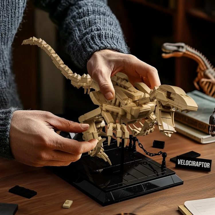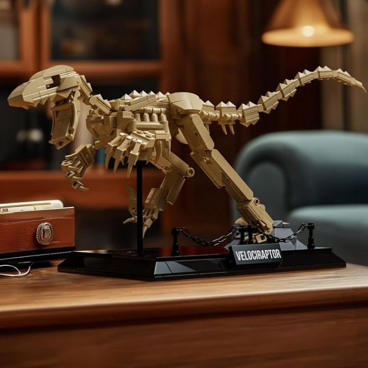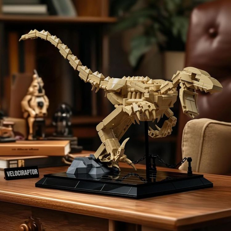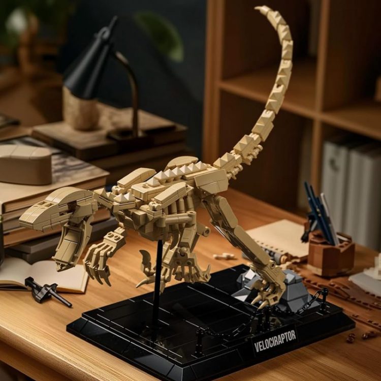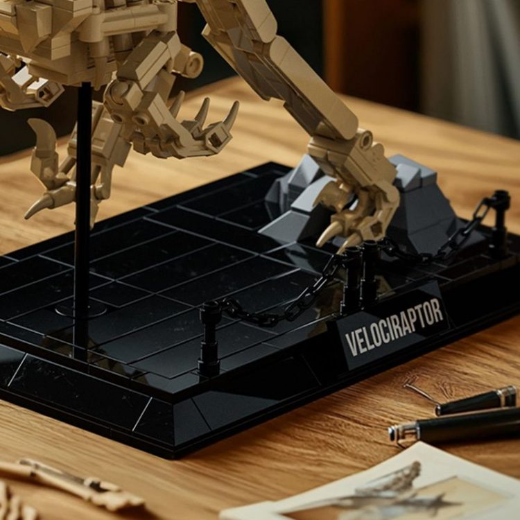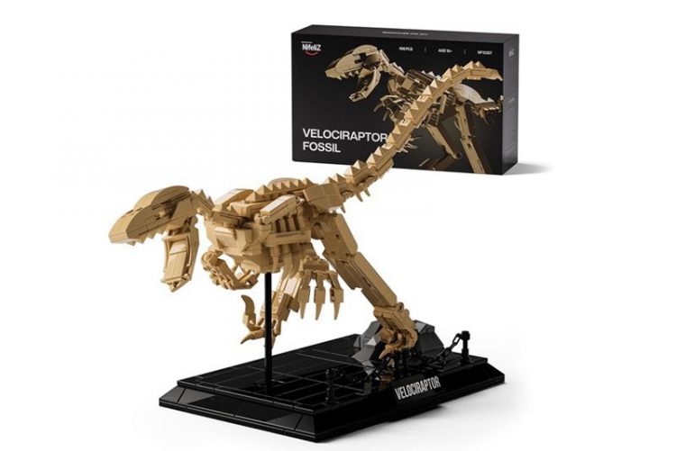 Nifeliz 迅猛龙 Velociraptor 化石模型展示恐龙骨骼结构,精瘦的身形和捕食者的姿态,反映史前世界的生命形态。积木需要自己 DIY 动手拼装,完成后,带展示底座,头部、手臂和尾巴可以摆出不同的姿势,用作桌面摆件。