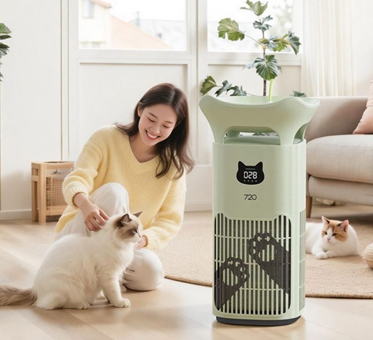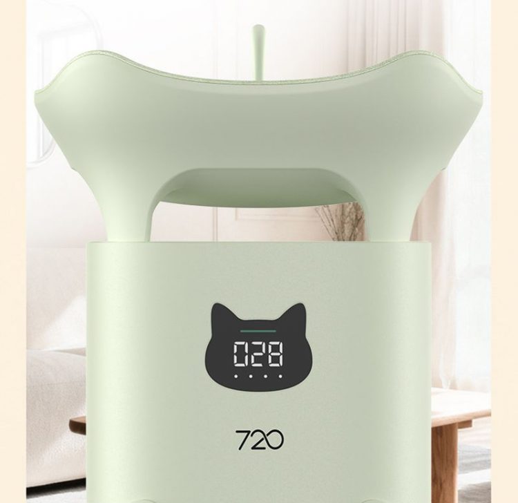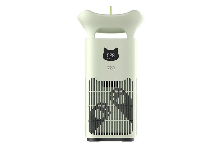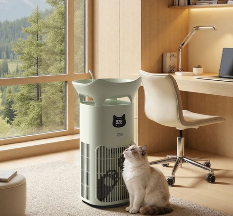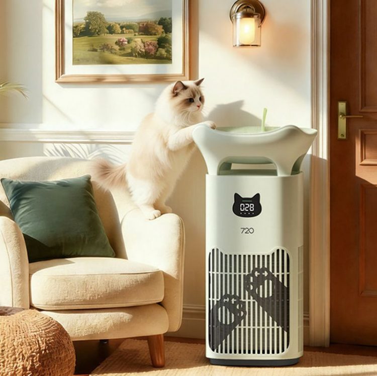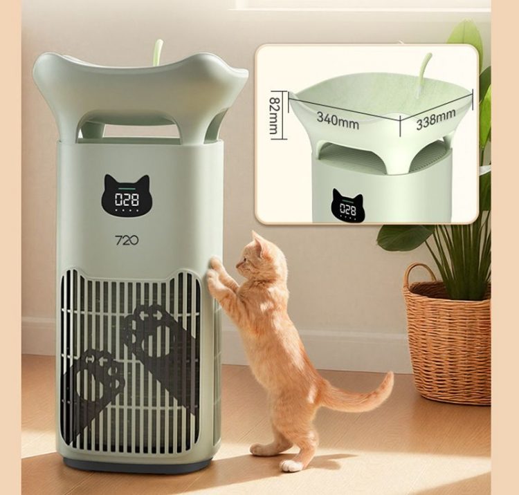 720 P5 宠物空气净化器采用大头喵造型,萌趣外观,顶部猫窝,自带配重防止倾倒,用于吸猫毛、去除过敏原、异味,保证家庭空气清洁。