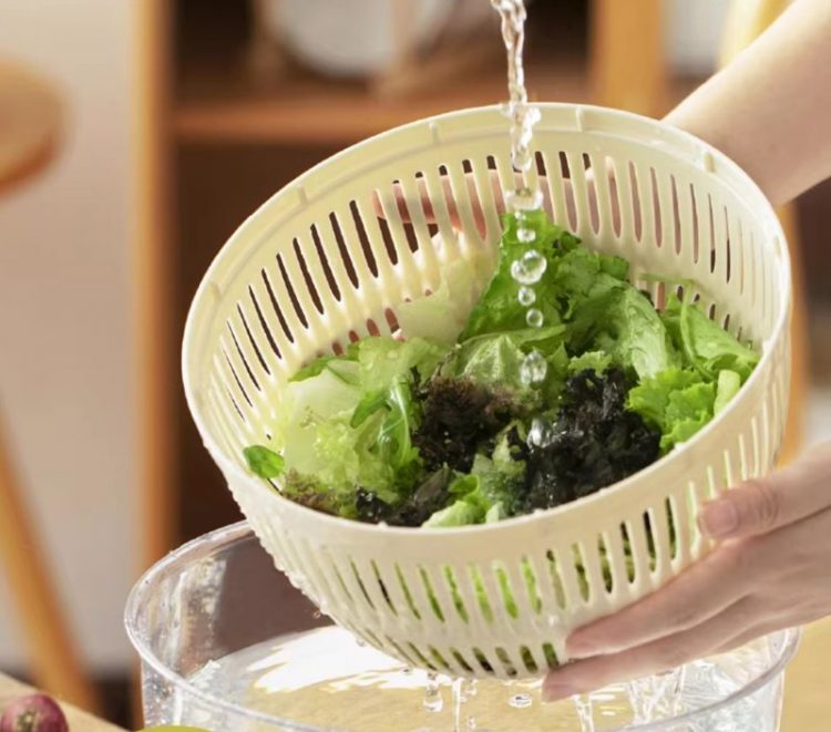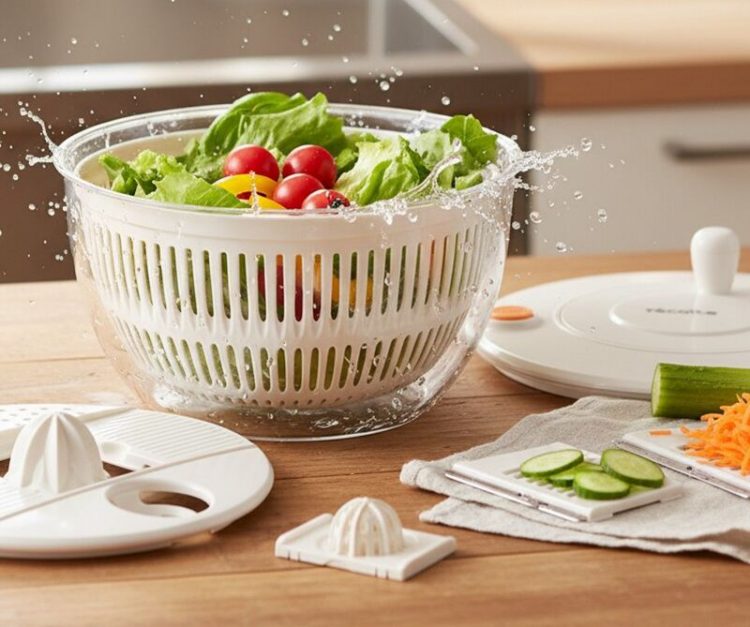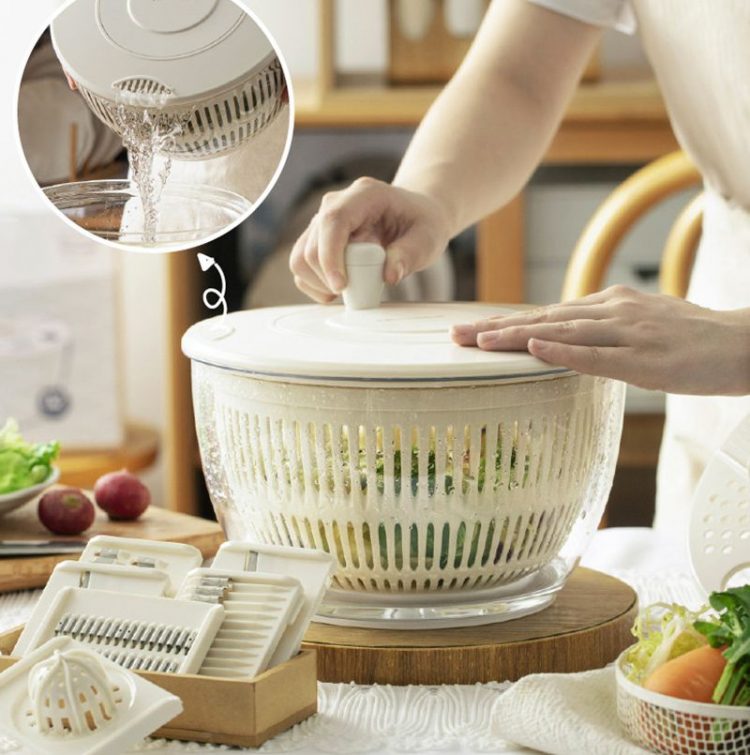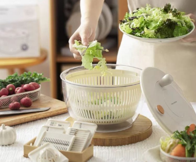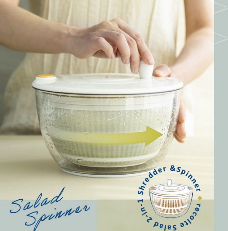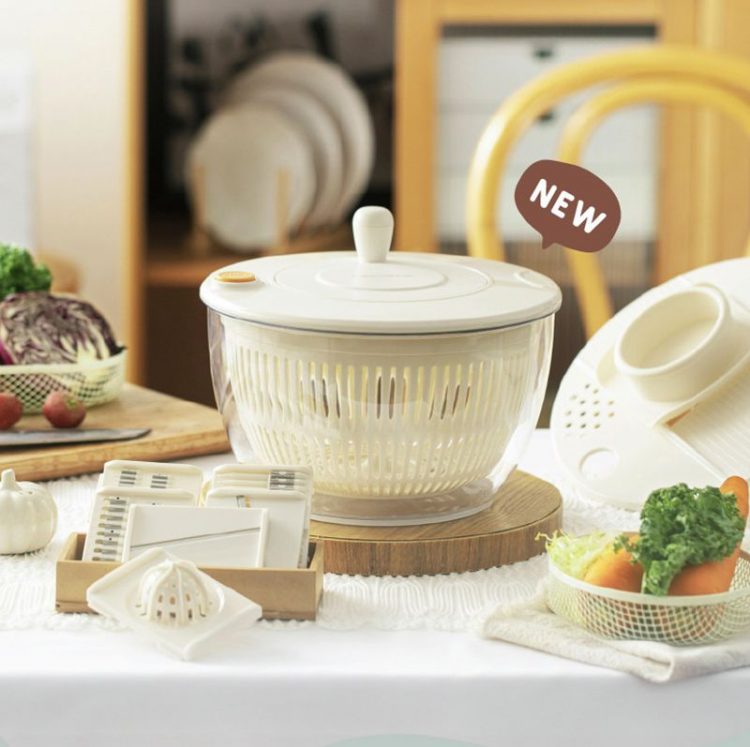 丽克特 Recolte 蔬菜沙拉脱水器既是洗菜蓝,也是刨丝器,带多种刀盘,可用来擦丝、切片,支持手动离心脱水甩干,避免过多水分。