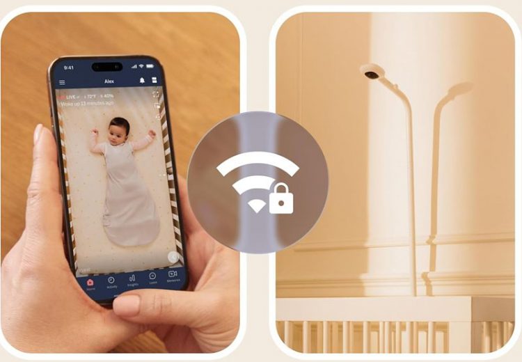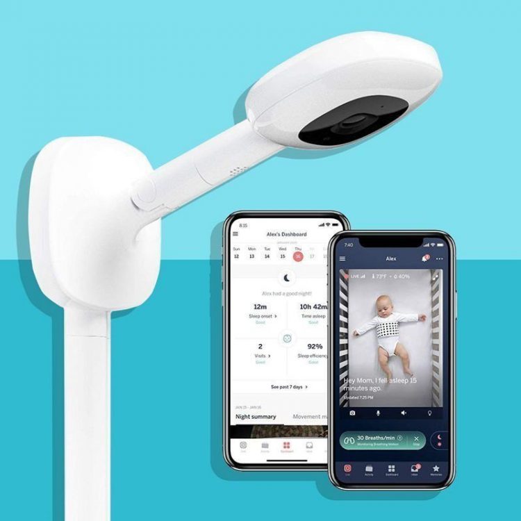 Nanit Pro 智能婴儿监护摄像头安装在婴儿床上方,获得高清宝宝“鸟瞰图”画面,支持双向音频、带红外夜视,自动进行睡眠分析,实时监测每分钟呼吸频率(BPM),并生成详细的睡眠报告和改善建议,保证宝宝健康。