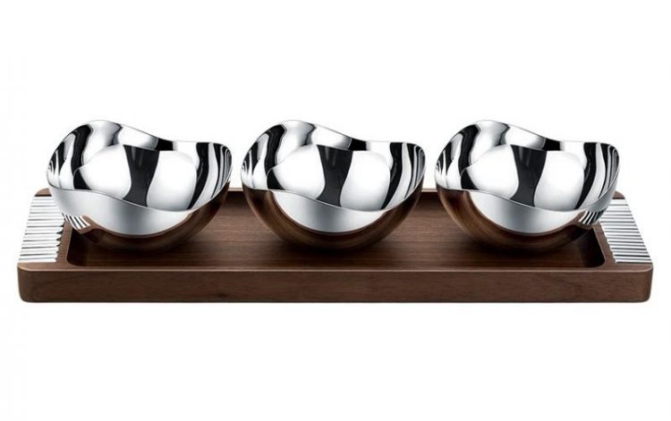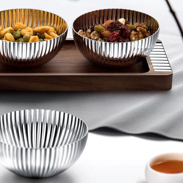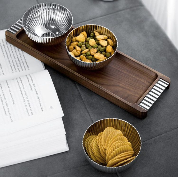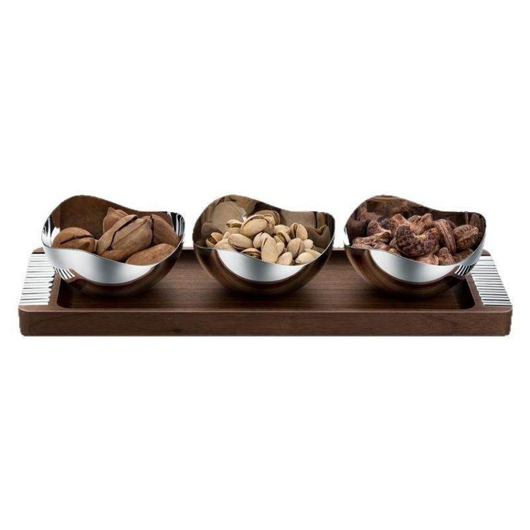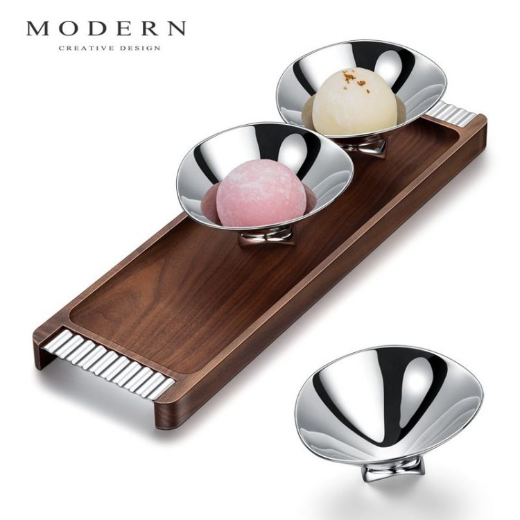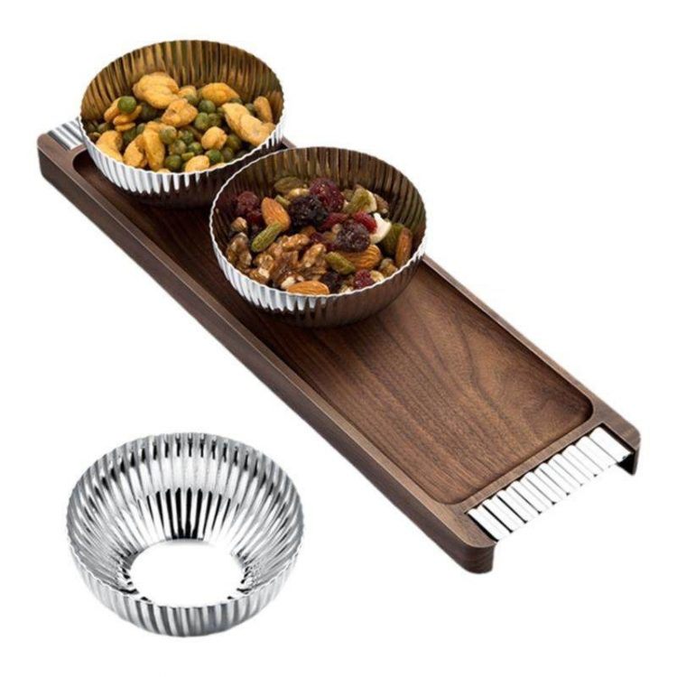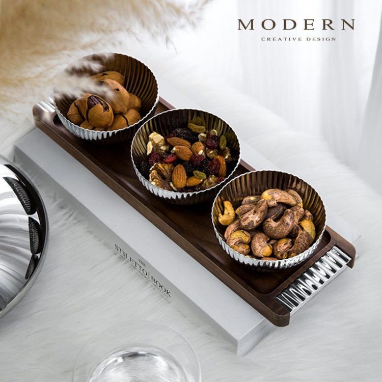 干果盘采用实木胡桃木托盘,不锈钢零食碗,轻奢茶几摆件。