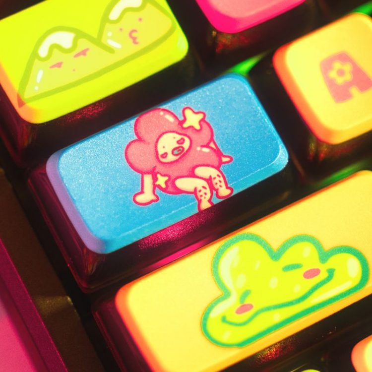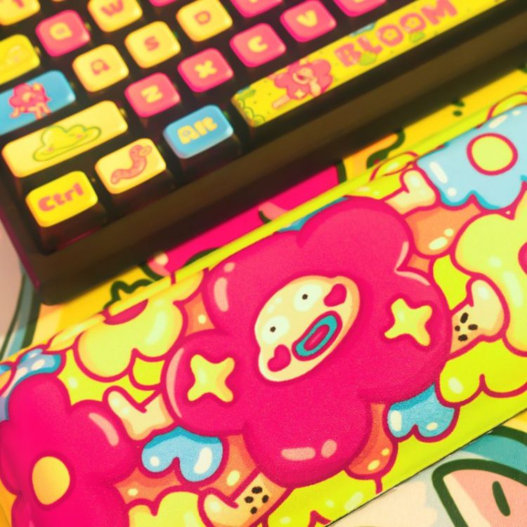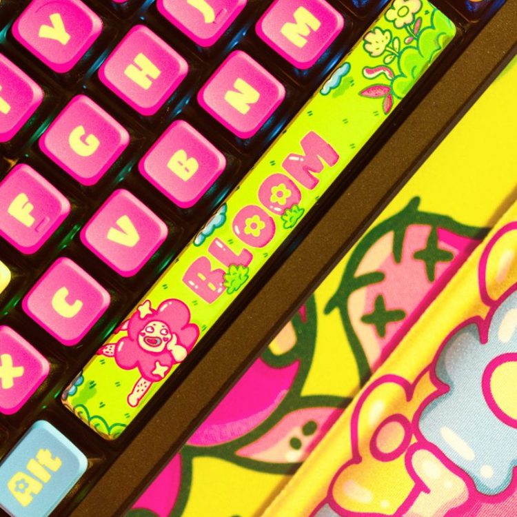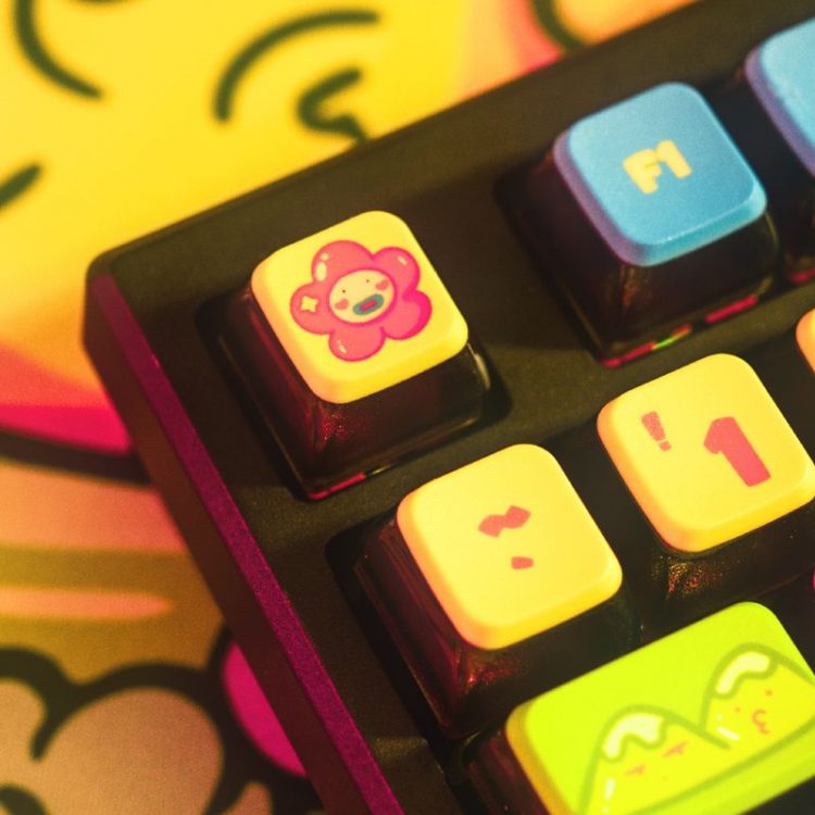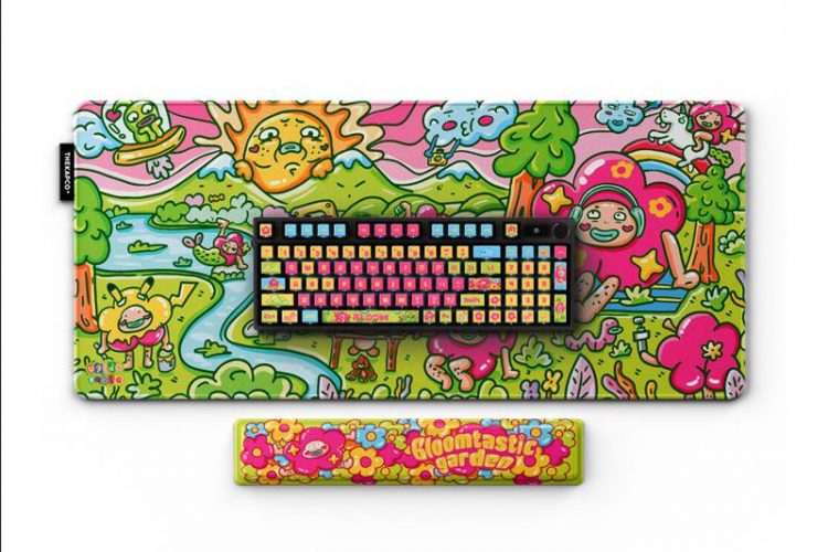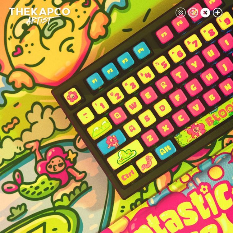 Thekapco x Ugldorable 联名 繁花花园 Bloomtastic Garden 主题机械键盘将艺术和创造力融入工作,采用经典插画形象,114 按键, PBT 材质键帽,热升华图案,标准 ANSI 布局,右上角设有LCD 智能显示屏(电池、日期、时间和连接 | Thekapco 动画)及多媒体旋钮,支持热插拔键轴,三模(蓝牙、2.4Ghz、Type-C 有线)连接设备,让您的工作空间充满活力,带来更多欢乐。