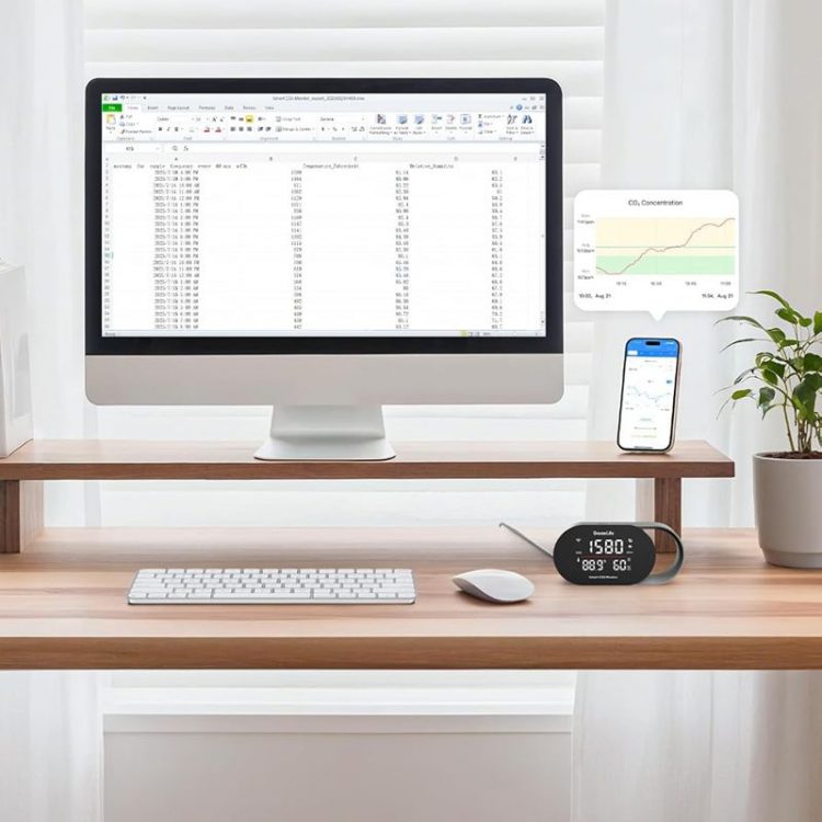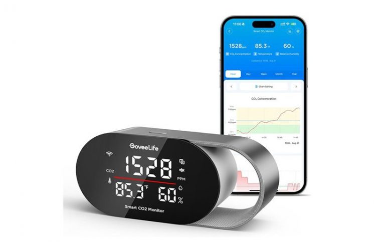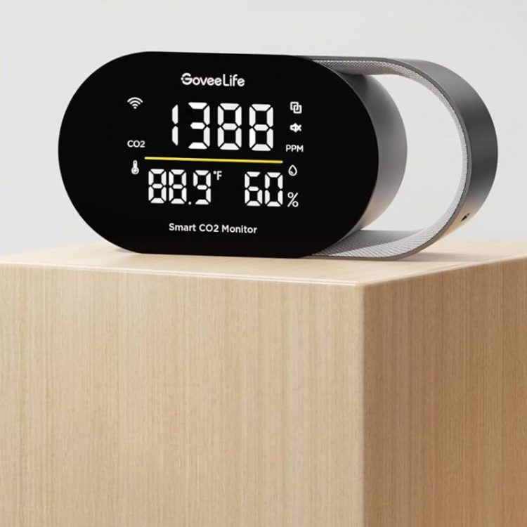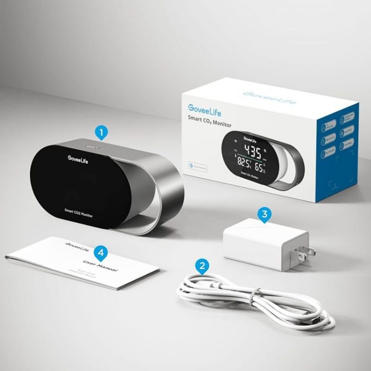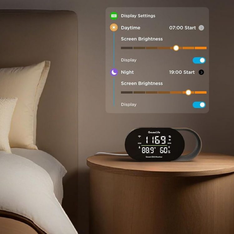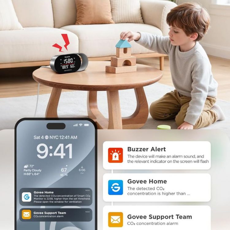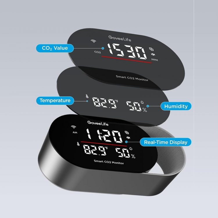 GoveeLife H5140 智能空气质量检测仪配备 SCD4 x CO2 传感器(光声 NDIR 原理,非色散红外),进行二氧化碳浓度检测,适合家庭和办公室使用,自带 LED 显示屏,显示记录四项关键指标:实时二氧化碳浓度(5 秒一次的刷新率)、温度(°F/°C)、湿度(%RH)和时钟(需连接APP),全面了解室内空气质量,内置压力补偿功能,适用于任何海拔高度。屏幕下方配有三色指示灯条。当 CO2 浓度超标时,灯条会从绿色变为黄色或红色,提醒你需要开窗通风,避免氧气不足造成的头痛和困倦,改善注意力不集中现象。
