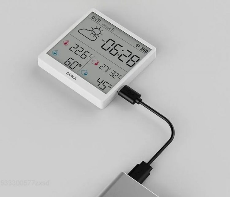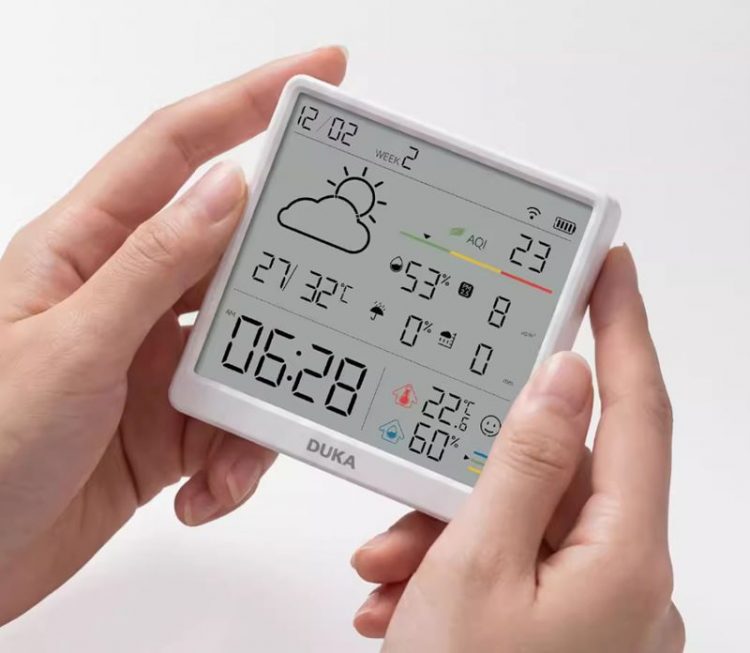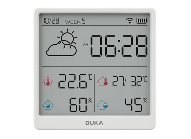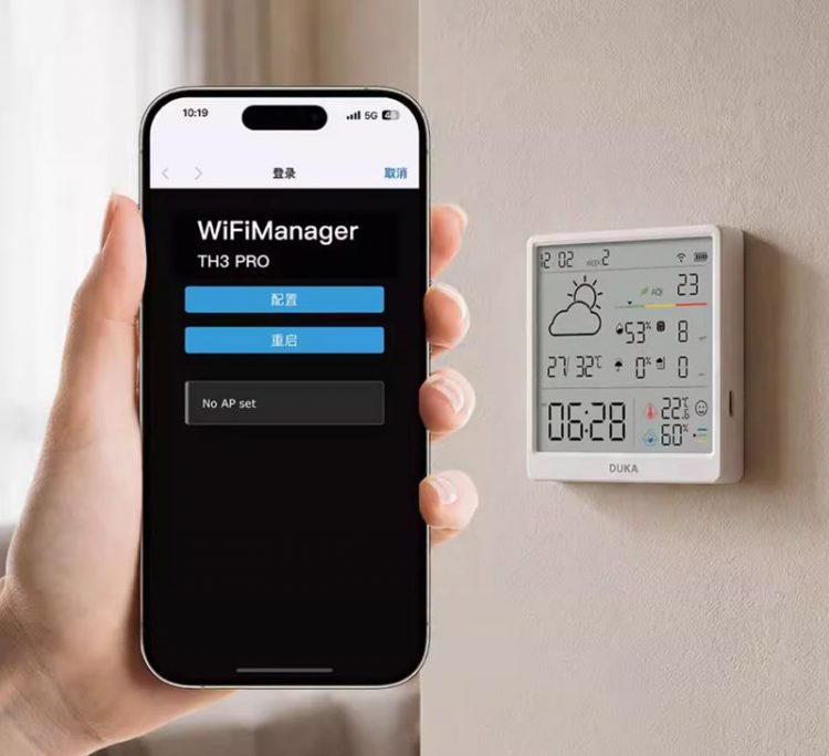 杜克 Duka TH3pro 智能温湿度计支持 WiFi 联网,集成了温湿度监测、时钟、天气预报及 PM2.5 实时监测的多功能智能设备,可 LCD 高清显示监测数据和气象预报,持通过手机端查看环境数据的实时状态与历史曲线,并能设置温湿度超限提醒。