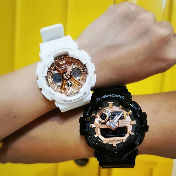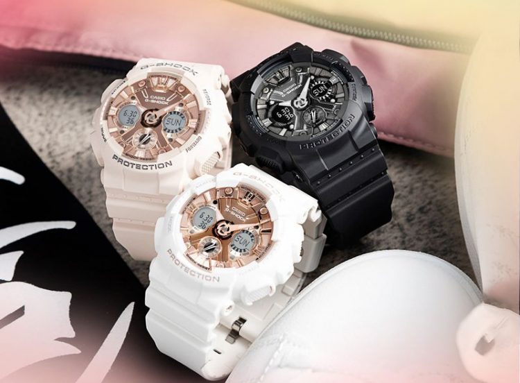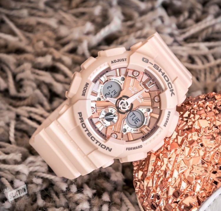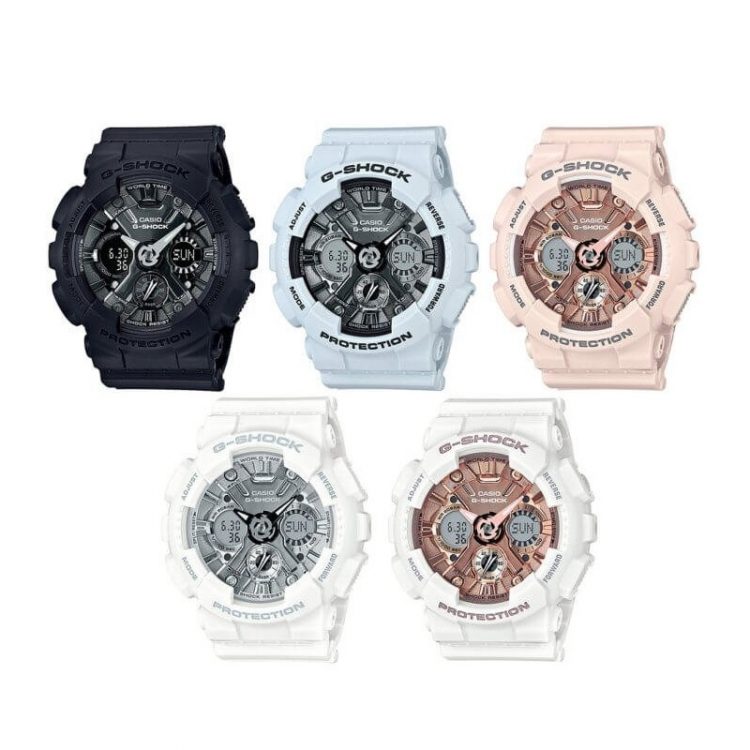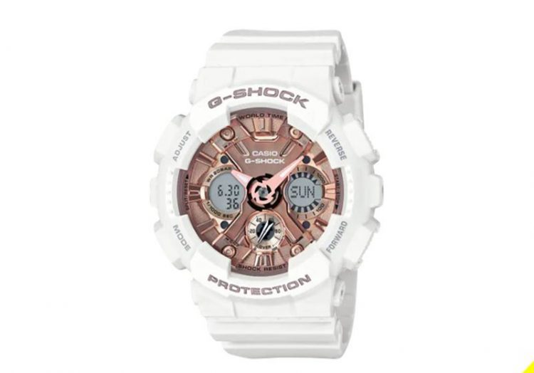 卡西欧 Casio G-SHOCK GMA-S120MF 手表适合女性佩戴,采用标志性齿轮状表盘设计,采用指针与数字双显设计,搭配纯色树脂表带,风格简约时尚。