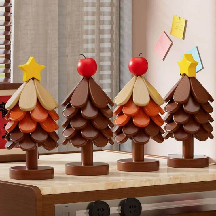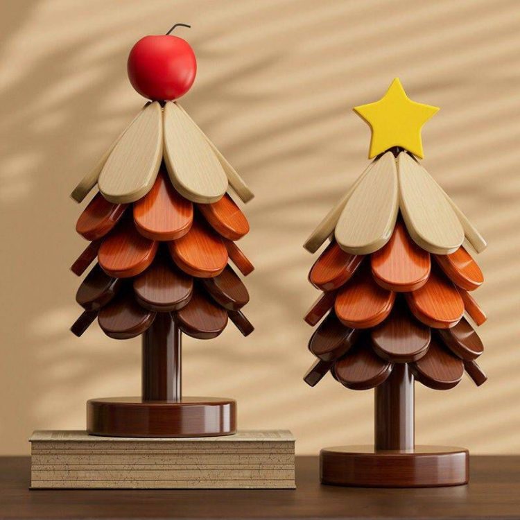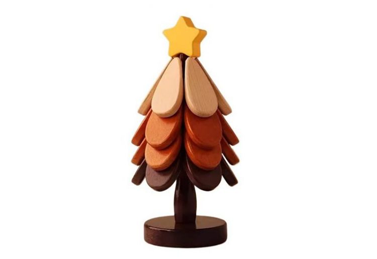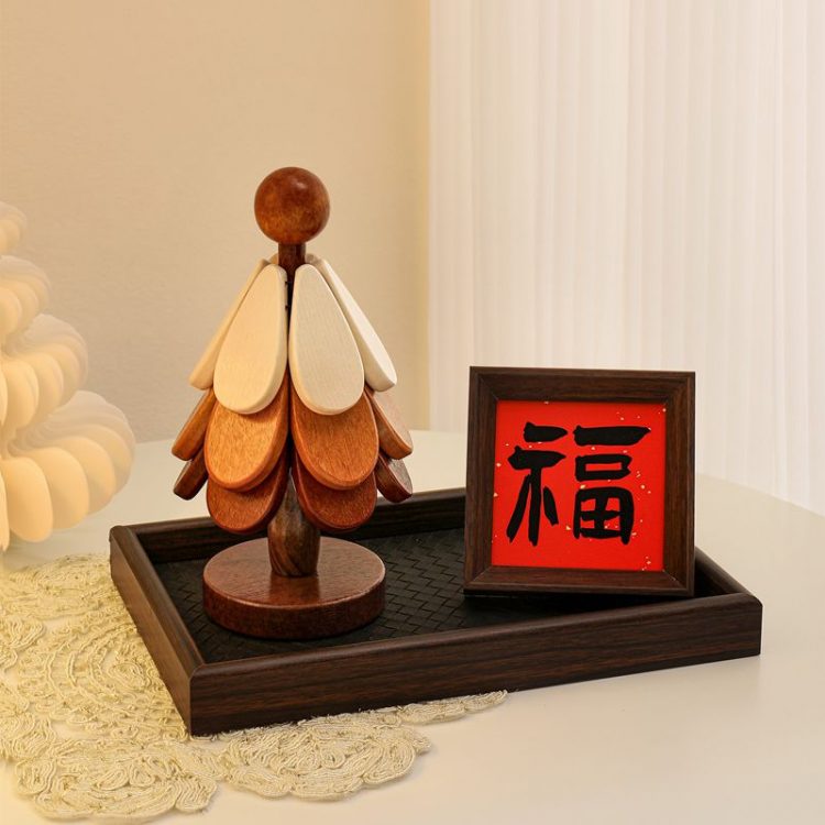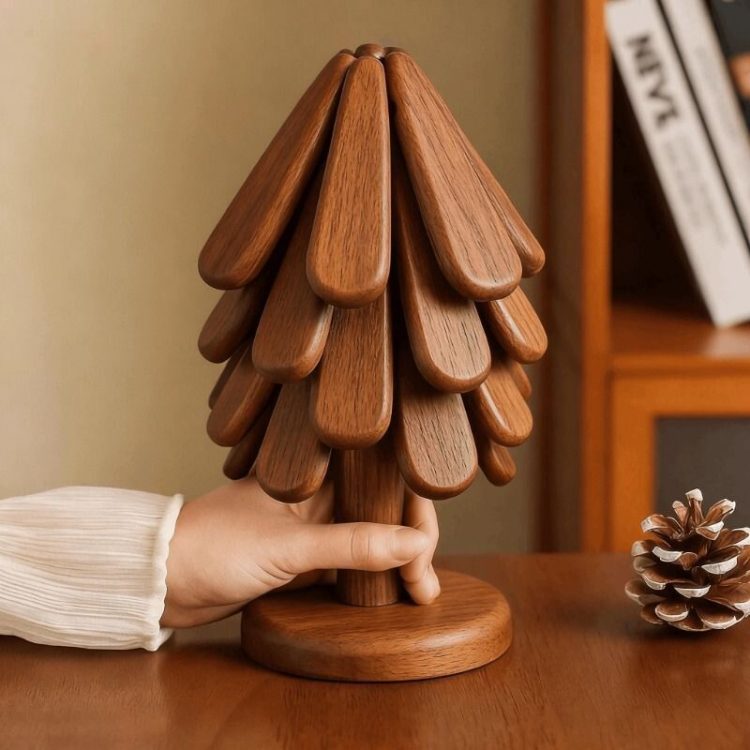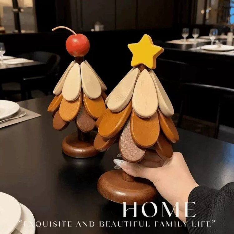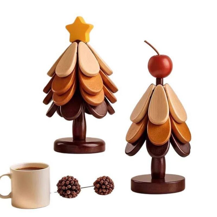 创木工坊 圣诞树隔热垫实木材质,平时不用时,放在餐桌上用作摆件,需要时,取下“树叶”,每一片都是一个独立的十字形隔热垫。