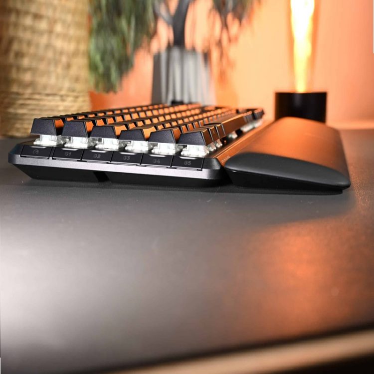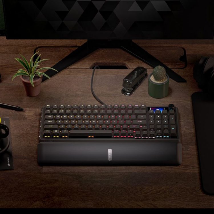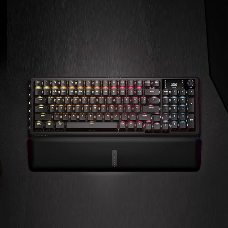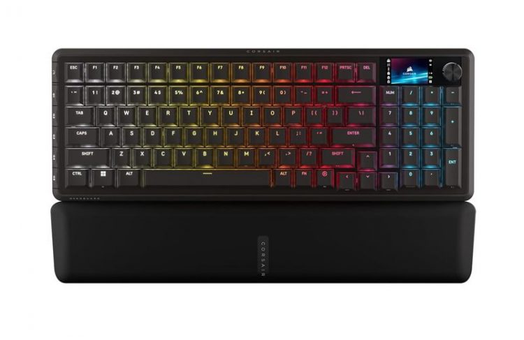 美商海盗船 Corsair Vanguard 96 Wireless 三模无线机械键盘采用 96% 全尺寸布局(含数字小键盘、方向键和功能行),配备一个可自定义多媒体拨轮以及 6 个专用 G 键,这些按键可配合 Elgato Virtual Stream Deck 软件,一键触发直播推流、宏指令或控制智能家居。右上方设置了一个 320×170 像素 IPS 采用智慧屏,可以实时显示系统状态(如 CPU 温度)、自定义 GIF 动画、图片,或者配合旋钮显示设置菜单。
