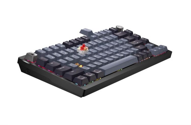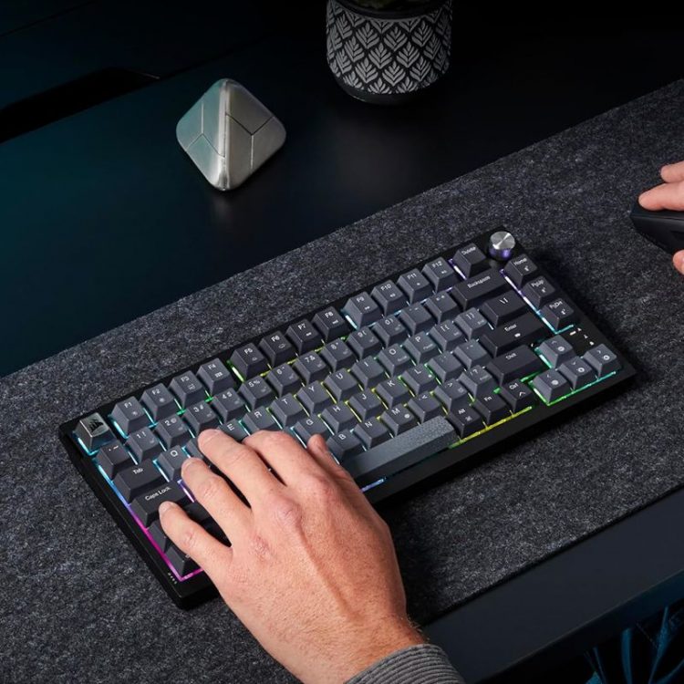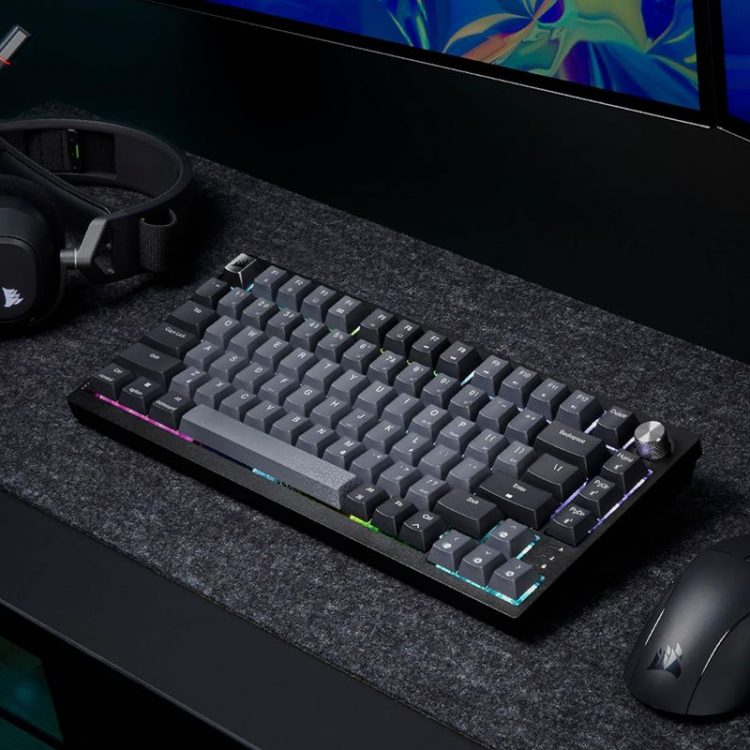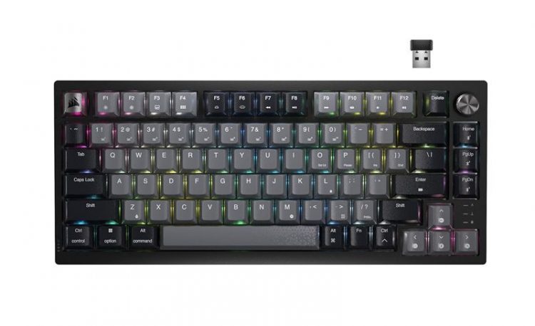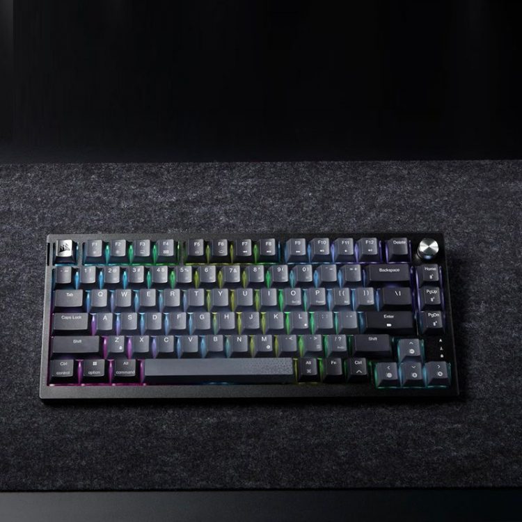 美商海盗船 Corsair K65 Plus 无线游戏键盘三模连接,采用 75% 紧凑布局,无数字区,保留箭头键和功能键,RGB 背光,右上角配有一个金属多功能旋钮,可用来控制音量、滚动、缩放等操作。全键热插拔(兼容 3 脚和 5 脚轴体),多层消音结构,PBT 热升华键帽,适合 FPS 游戏操控。