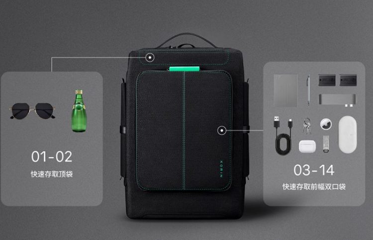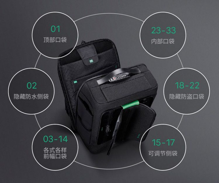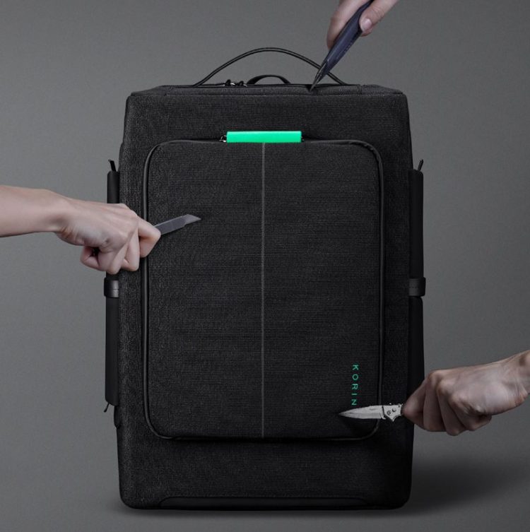 Korin HubPack 33 方形防盗背包适合城市通勤/商务旅行背包,其内部拥有多达 33 个独立收纳空间,采用高比例玻璃纤维编织的防割材质,能有效抵御刀片划包盗窃,配备 TSA 海关密码锁和高强度伸缩钢缆,可以将背包锁在固定物体(如椅子或栏杆)上,防止整包被拎走,肩带上设有 RFID 屏蔽口袋,防止信用卡和护照信息被非法读取。