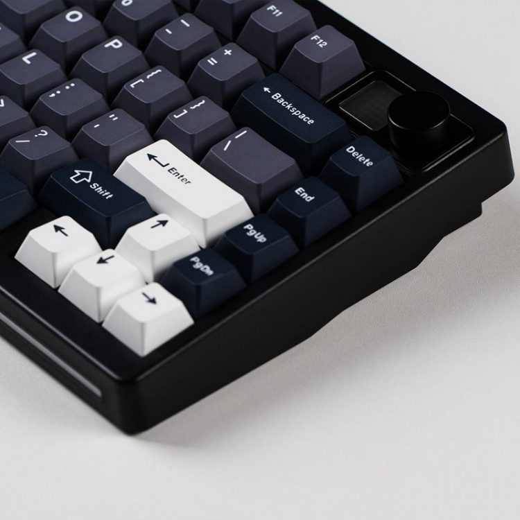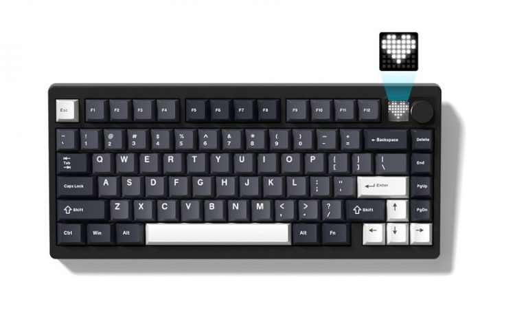 沃弥尔 Womier MT75 三模无线键盘采用 75% 紧凑布局,全 CNC 铝合金外壳,简约工业风,Gasket 结构, PBT 双色注塑键帽,RGB 灯效,全键热插拔,右上角设有 7×7 RGB 点阵显示屏和多媒体金属旋钮,方便操作并显示动态自定义图案。